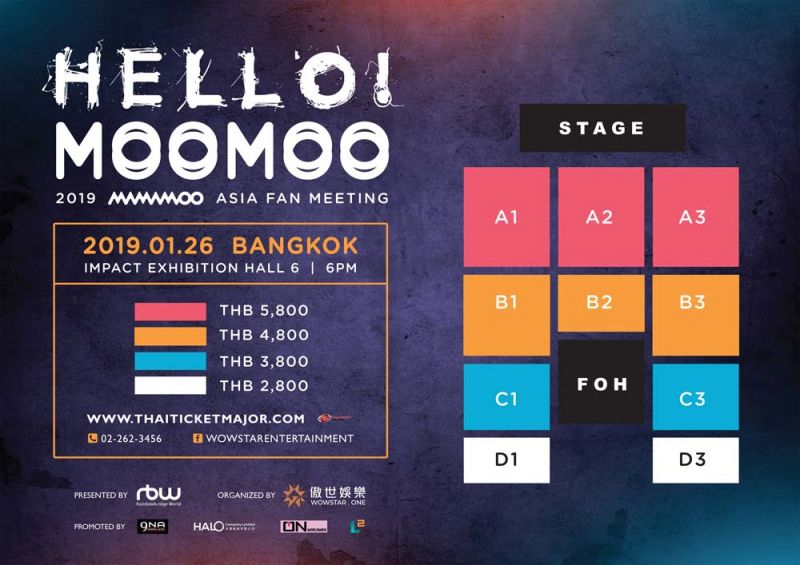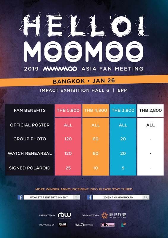 แฟนมีตติ้งเอเชียทัวร์ เริ่มที่ไทยเป็นที่แรก ใน 2019 MAMAMOO Asia Fanmeeting วันที่26 มกราคม 2562 ที่ Impact Exhibition Hall 6 โดยสามารถซื้อบัตรได้ตั้งแต่ วันที่ 5มกราคมนี้ ราคาบัตรคือ 5,800 บาท (โซน A), 4,800 บาท (โซน B), 3,800 บาท (โซน C)และ 2,800 บาท (โซน D) ที่ www.thaiticketsmajor.com และเคาท์เตอร์ Thai Ticket Major ทุกสาขา