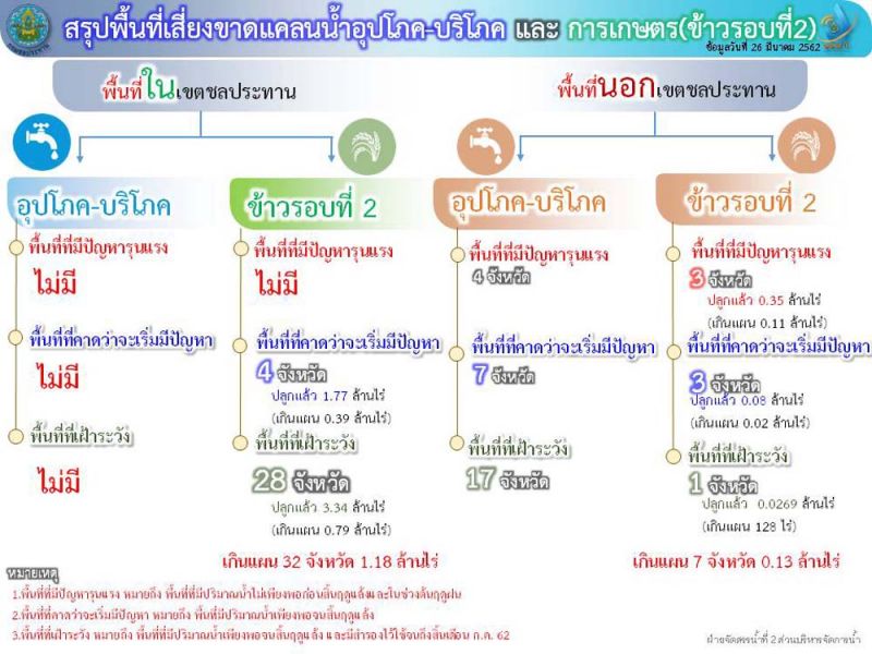 ส่วนพื้นที่นอกเขตชลประทาน จะมีพื้นที่มีปัญหารุนแรง ในเรื่องน้ำ อุปโภค บริโภค 4จังหวัด และพื้นที่ที่คาดว่าจะเริ่มมีปัญหา7จังหวัด พื้นที่เฝ้าระวัง17จังหวัด พื้นที่ปลูกข้าวรอบ2 มีพื้นที่มีปัญหารุนแรง3จังหวัด ปลูกแล้ว0.35 ล้านไร่ เกินแผน 0.11ล้านไร่ พื้นที่คาดว่าจะเริ่มมีปัญหา3จังหวัด ปลูกแล้ว0.08จังหวัด เกินแผน0.02ล้านไร่ พื้นที่เฝ้าระวัง1จังหวัด ปลูกแล้ว0.0269 ล้านไร่ เกินแผน123 ไร่ รวม7จังหวัดเกินแผน0.13ล้านไร่