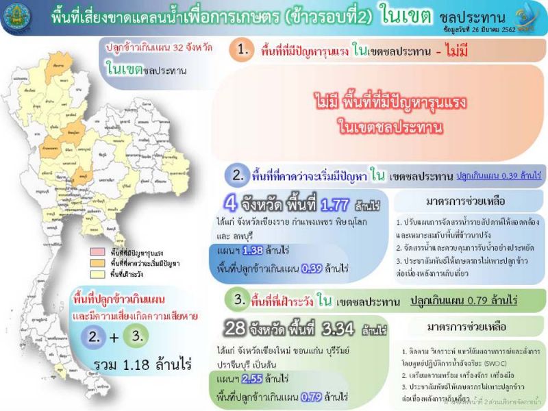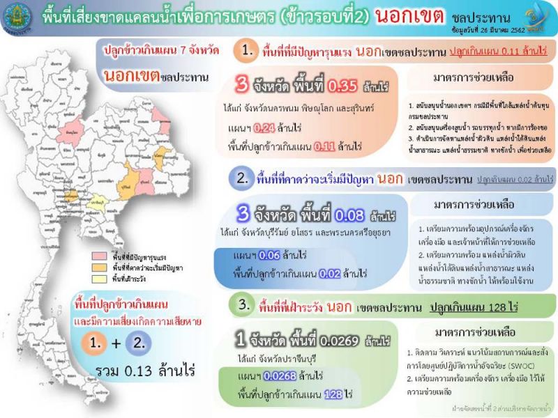 อธิบดีกรมชลประทาน กล่าวว่าสำหรับพื้นที่ปลูกข้าวเกินแผน7จังหวัด นอกเขตชลประทาน ที่เสี่ยงมีปัญหารุนแรง3จังหวัด พื้นที่0.35ล้านไร่ ได้แก่ นครพนม พิษณุโลก สุรินทร์ เกินแผน 0.11ล้านไร่ ส่วนพื้นที่เริ่มมีปัญหา 3จังหวัด พื้นที่0.08ล้านไร่ เช่น บุรีรัมย์ ยโสธร และพระนครศรีอยุธยา เกินแผน0.02ล้านไร่ พื้นที่เฝ้าระวัง 1จังหวัด เช่น ปราจีนบุรี เกินแผน 128ไร่ มาตรการช่วยเหลือ สนับสนุนน้ำนอกเขต กรณีมีพื้นที่ใกล้แหล่งน้ำต้นทุนกรมชลประทาน สนับสนุนเครื่องสูบน้ำ รถบรรทุกน้ำ ดำเนินการจัดหาแหล่งน้ำผิวดิน แหล่งน้ำใต้ดิน น้ำสาธารณะ แหล่งน้ำธรรมชาติ