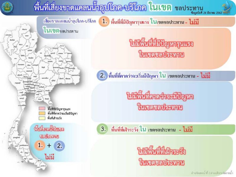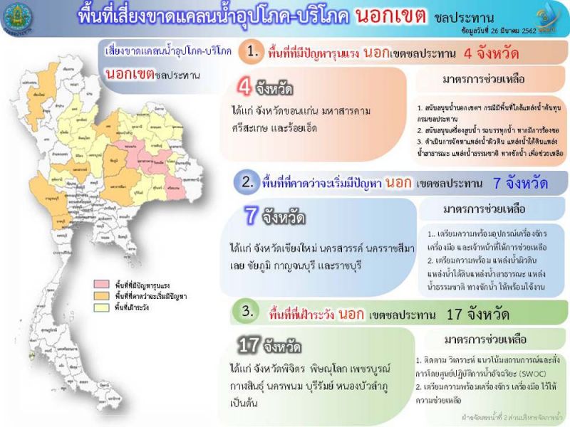 ในส่วนพื้นที่เสี่ยงขาดแคลนน้ำอุปโภคบริโภค ในเขตชลประทาน ไม่มี จะมีปัญหานอกเขตชลประทาน มีพื้นที่ที่มีปัญหารุนแรง4จังหวัด เช่น ขอนแก่น มหาสารคาม ศรีสะเกษ ร้อยเอ็ด พื้นที่คาดว่าจะเริ่มมีปัญหา 7จังหวัด เช่น เชียงใหม่ นครสวรรค์ เลย ชัยภูมิ กาญจนบุรี ราชบุรี และพื้นที่เฝ้าระวัง 17 จังหวัด เช่น พิจิตร พิษณุโลก เพชรบูรณ์ กาฬสินธ์ุ บุรีรัมย์ หนองบัวลำภู