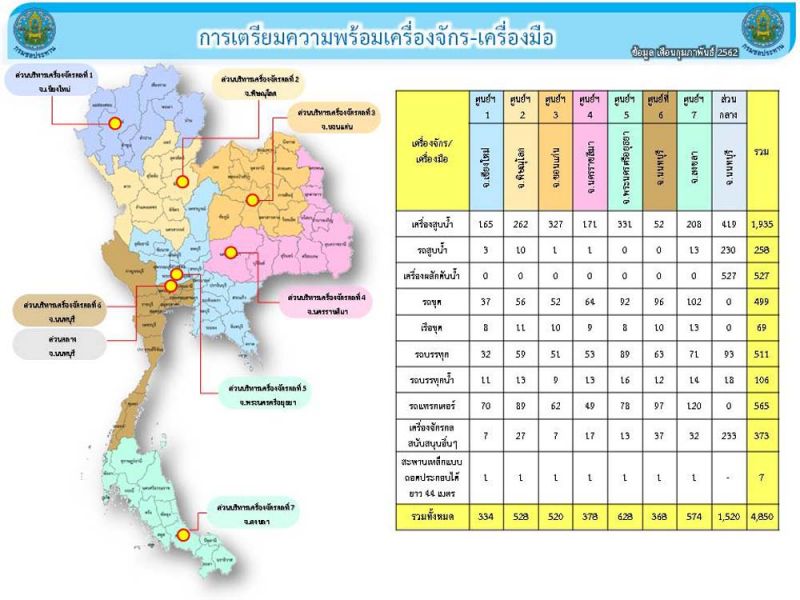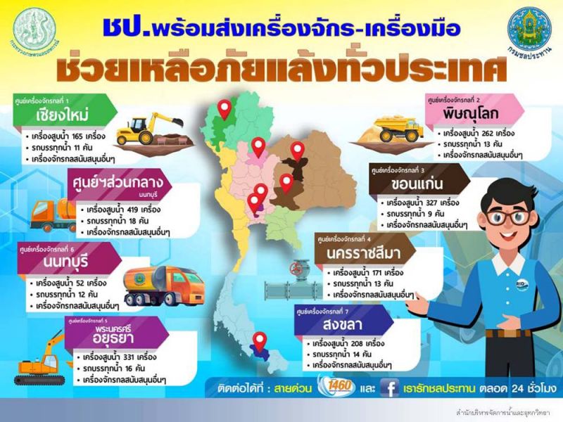 กรมชลประทาน พร้อมส่งเครื่องจักร เครื่องมือช่วยเหลือภัยแล้งทั่วประเทศ โดยเตรียมไว้ที่ศูนย์เครื่องจักรกลทุกพื้น เช่น ศูนย์ที่1 เชียงใหม่ เครื่องสูบน้ำ 165เครื่อง รถบรรทุกน้ำ11คัน เครื่องจักรกลอื่นๆไว้สนับสนุน ศูนย์ส่วนกลาง เครื่องสูบน้ำ 419 เครื่องรถบรรทุก 18คัน และอื่นๆ ศูนย์นนทบุรี เครื่องสูบน้ำ 52 เครื่อง รถบรรทุกน้ำ 12 คัน ศูนย์พระนครศรีอยุธยา เครื่องสูบน้ำ 331 เครื่อง รถบรรทุกน้ำ 16 คัน ศูนย์พิษณุโลก เครื่องสูบน้ำ262 เครื่อง รถบรรทุกน้ำ13คัน ศูนย์ขอนแก่น เครื่องสูบน้ำ 327 เครื่อง รถบรรทุกน้ำ 9คัน ศูนย์นครราชสีมา เครื่องสูบน้ำ 17 เครื่อง รถบรรทุกน้ำ 18คัน ศูนย์สงขลา เครื่องสูบน้ำ 208 เครื่อง รถบรรทุกน้ำ 14คัน และอื่นๆ รวม 4,850 ชุด