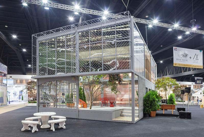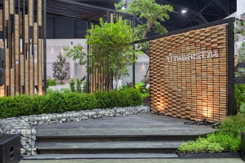 อย่างแรกคือการใช้วัสดุหรือลวดลายธรรมดาๆ ที่เราอาจจะเคยเห็นชินตาอยู่ทั่วไป แต่เอามาใช้จนเกิดจังหวะที่สวยงามน่าสนใจเป็นพิเศษขึ้นได้ อย่างที่สองคือการรู้จักใช้เครื่องมือทันสมัยมาช่วยในการผลิตให้ได้เร็วขึ้น เที่ยงตรงขึ้น ผสมกับการใช้ฝีมือของคนที่แม้ช้ากว่าแต่มีเสน่ห์ของความไม่เหมือนกัน โดยเราลงมือก่อสร้างส่วนต่างๆ ของงานบ้านและสวนแฟร์ด้วยแนวคิดนี้เช่นกัน ตั้งแต่ซุ้มทางเข้าที่โรงพิมพ์ของเราผลิตให้และนำมาประกอบขึ้น บ้านตัวอย่างที่เราทำงานร่วมกับสถาปนิกจาก SO Architects หรือสวนโชว์ที่เราทำงานร่วมกับนักจัดสวนที่ Pergolar รวมไปถึงการออกแบบ Art Direction ที่เราทำงานร่วมกับกราฟิกดีไซเนอร์ที่ Farm Group โดยได้แรงบันดาลใจจากของเล่นตัวต่อรูปร่างซ้ำๆ กัน แต่ใช้จินตนาการมาต่อกันเป็นอะไรก็ได้