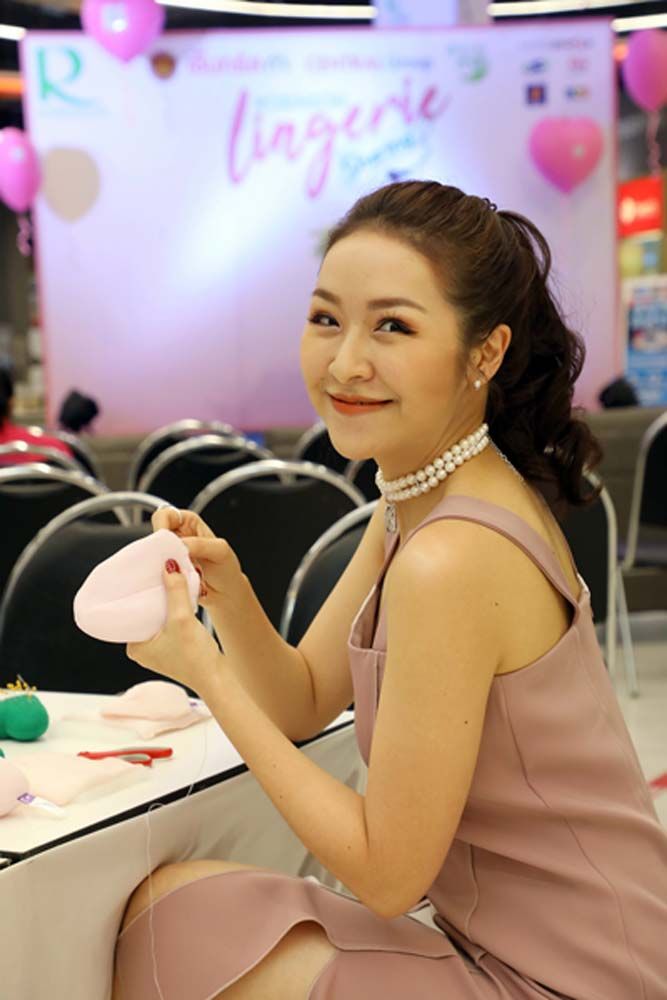 ในงานยังมีสองเซเลบริตี้ เอ๋-ชินนารี รักปทุม และ โบว์-ณชา จึงกานต์กุล มาร่วมกิจกรรมเย็บเต้านม พร้อมเผยถึงการดูแลตัวเองให้ห่างไกลจากมะเร็งเต้านม เริ่มที่ โบว์-ณชา บอกว่า “การเลือกซื้อบราที่ดี คือการเลือกบราที่เหมาะสมกับเรา ใส่แล้วมั่นใจ โบว์จะเลือกซื้อบราหลากหลายแบบ และเลือกใส่ให้เหมาะสมกับกิจกรรมหรือรูปแบบในการใช้งาน เช่น ใส่ไปออกกำลังกายควรเป็นบราอีกประเภทที่ไม่ได้รัดจนเกินไป บราสำหรับใส่ออกงาน ควรเน้นความเหมาะสมและสีสัน และที่ควรทำเป็นประจำคือ การหมั่นตรวจสุขภาพเต้านมตนเองบ่อยๆ พยายามหลีกเลี่ยงการทานอาหารประเภทของทอด ย่าง ซึ่งเป็นสาเหตุของการเกิดมะเร็งได้ ซึ่งโบว์ก็ได้ทราบวิธีการตรวจสุขภาพตนเองเบื้องต้นจากการจัดงานเสวนา และยังได้ร่วมกิจกรรมเย็บเต้านมเทียม เพื่อนำไปมอบให้กับผู้ป่วยมะเร็งเต้านมที่ยากไร้ ผ่านทางโรงพยาบาลต่างๆ ของรัฐทั่วประเทศ ซึ่งเป็นกิจกรรมที่ดีมาก”
