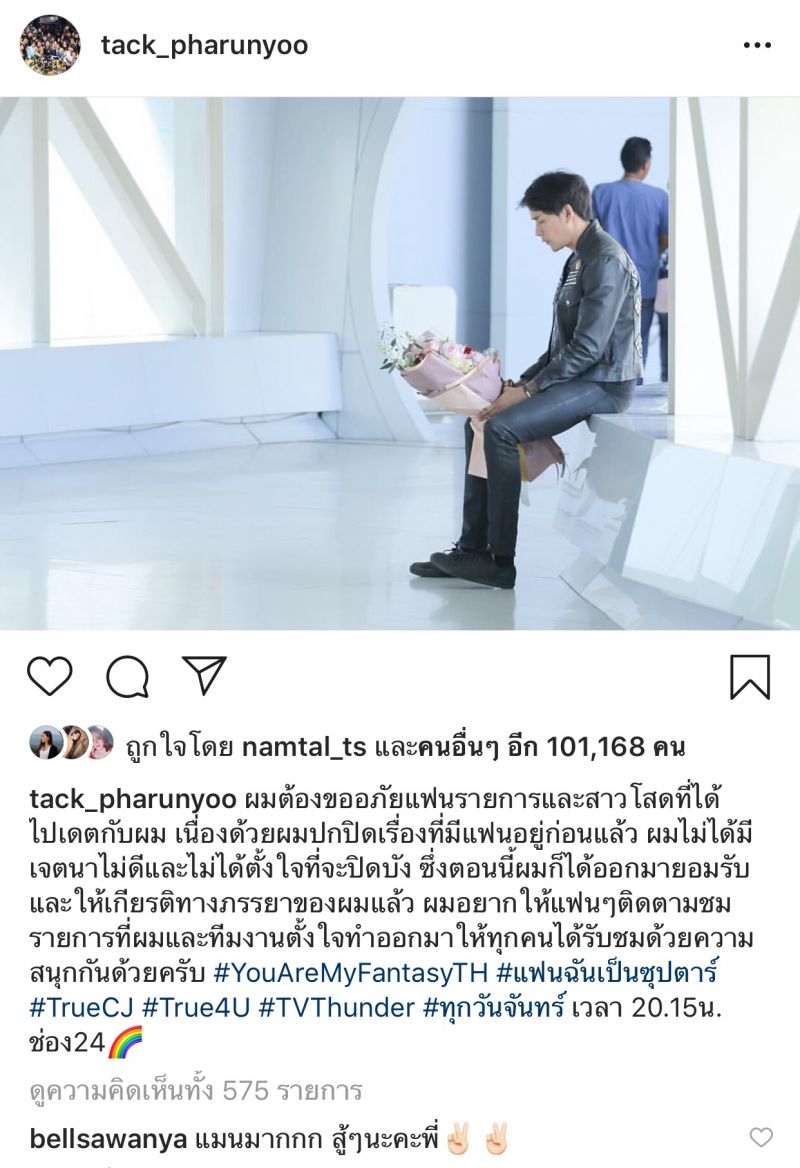 ล่าสุดนี้ หนุ่มแทค ขอเคลียร์เรื่องที่ยังค้างคาใจ คือการที่เจ้าตัวได้ไปออกรายการ You Are My Fantasy แฟนฉันเป็นซุปตาร์ แล้วในรายการนั้นเจ้าตัวได้ปกปิดเรื่องมีแฟน แล้วได้ไปออกเดตกับสาวๆโดยหนุ่มแทคได้โพสต์ภาพตัวเอง พร้อมกับข้อความบรรยายว่า “ผมต้องขออภัยแฟนรายการและสาวโสดที่ได้ไปเดตกับผม เนื่องด้วยผมปกปิดเรื่องที่มีแฟนอยู่ก่อนแล้ว ผมไม่ได้มีเจตนาไม่ดีและไม่ได้ตั้งใจที่จะปิดบัง ซึ่งตอนนี้ผมก็ได้ออกมายอมรับและให้เกียรติทางภรรยาของผมแล้ว ผมอยากให้แฟนๆ ติดตามชมรายการที่ผมและทีมงานตั้งใจทำออกมาให้ทุกคนได้รับชมด้วยความสนุกกันด้วยครับ”