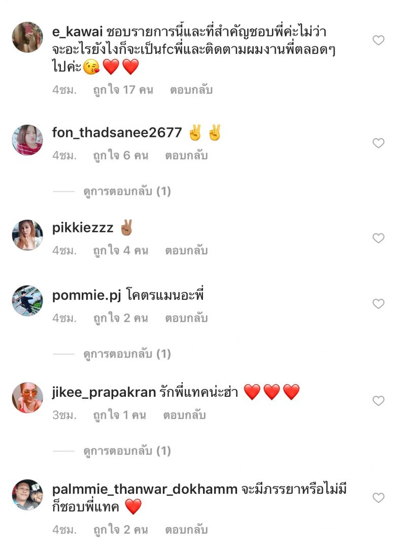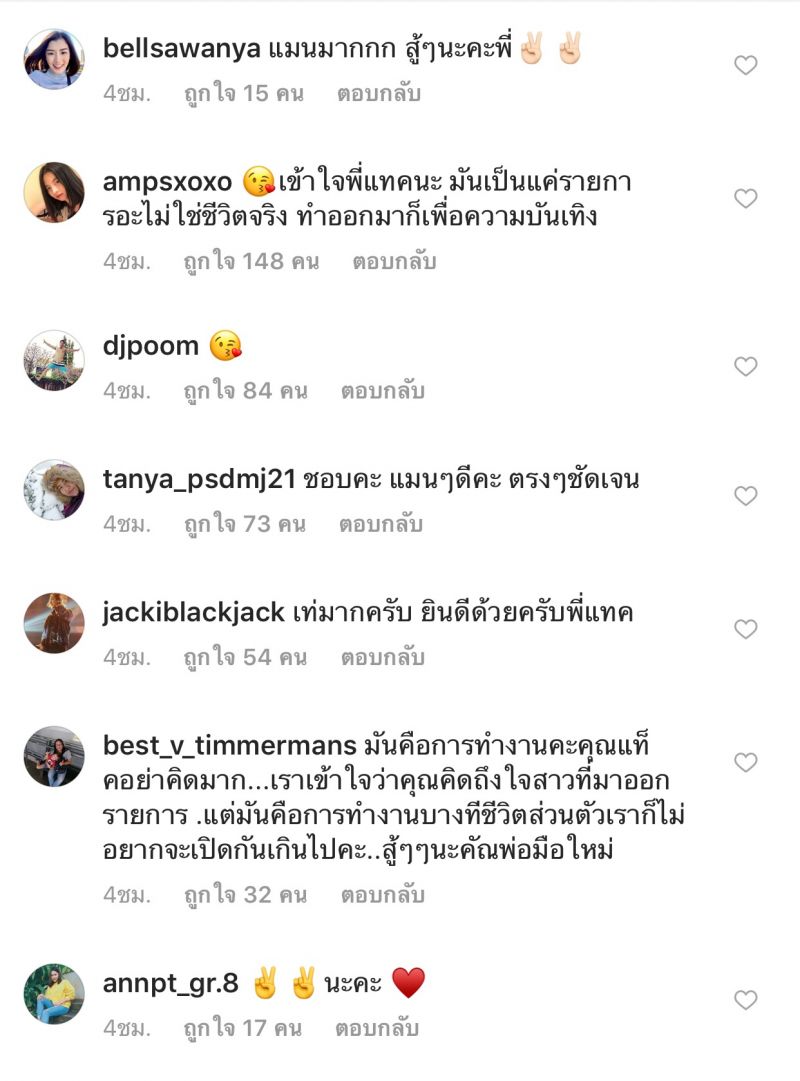 หลังจากที่หนุ่มแทค ได้โพสต์ข้อความและภาพดังกล่าวออกไป ทำให้แฟนๆได้เข้ามาคอมเมนต์ และให้กำลังใจอย่างล้นหลาม ต่างบอกว่า “สู้ๆครับ แทคเป็นคนน่ารัก ตรงๆ กันเอง ทุกคนในนี้รักแทคเสมอ จะติดตามน้องแทคเสมอนะ รักพี่มากๆเลยค่ะเจอตัวจริงพี่น่ารักมากๆเลยค่ะ บ้างก็บอกว่ามันแค่รายการไม่ใช่ชีวิตจริง ยังไงก็รักเหมือนเดิมค่ะ ไม่เป็นไรเฮีย เฮียเลี้ยงข้าวหนูหนูก็ไม่โกรธแล้ว”