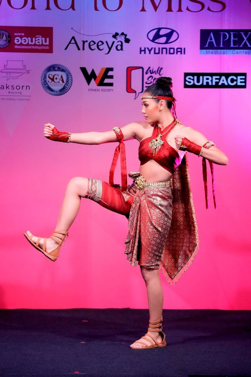 สำหรับโชว์ “สุโขศิลป์ถิ่นมวยสยาม” ที่จะใช้ออดิชั่นรอบ Dance Of The World ได้เลือกใช้เพลง ฮุยเลฮุย โชว์เปิดรอบตัดสิน ออกแบบและตัดเย็บโดย เอ็กซ์-อยุทธกาน จันทโชติ ห้องเสื้อเมอร์เรียดแกรนมอนด์ ได้แนวคิดมาจากสตรีสยามในอดีต ที่ไม่เพียงอ่อนหวานนุ่งซิ่นห่มสไบ หากในยามศึกสงครามก็พร้อมที่จะแสดงความเข้มแข็ง นุ่งโจงห่มตะเบ็งมาน ออกศึกเคียงคู่กับผู้ชาย ที่สำคัญศิลปะการต่อสู้มือเปล่าแบบมวยไทยก็แข็งแรงไม่แพ้ผู้ชาย และเอกลักษณ์ที่ถ่ายทอดรวมประดับไปกับชุดนี้มาจากเครื่องทองสุโขทัยในยุคก่อน ซึ่งนิยมลงยางดงามด้วยสีแดงและเขียว เมื่อประดับลงบนตะเบ็งมานสีแดงก่ำ ซึ่งเป็นสีที่แสดงถึงความเป็นชาติไทย ทำให้ชุดนี้งดงามอ่อนหวาน ผสมผสานความทะมัดทะแมงอย่างลงตัว
