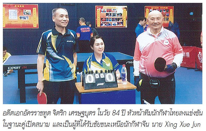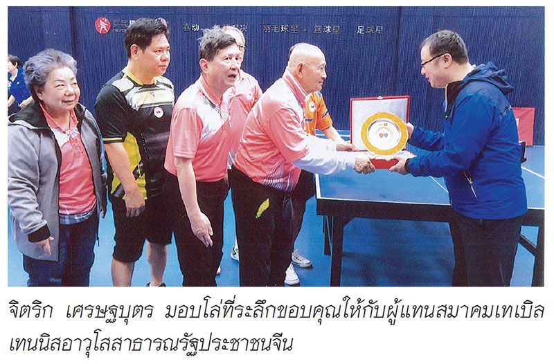 เพื่อกระชับมิตรไมตรีระหว่างประเทศไทยกับสาธารณรัฐประชาชนจีนที่มีความผูกพันมายาวนาน คณะชมรมเทเบิลเทนนิสอาวุโสไทย โดยมีอดีตเอกอัครราชทูต จิตริก เศรษฐบุตร เป็นหัวหน้าคณะ และ ท่านผู้หญิงวิวรรณ เศรษฐบุตร ร่วมเดินทางไปให้กำลังใจ พร้อมด้วย ประเสริฐ เรืองศรีเจริญรุ่ง ประธานชมรมฯ กับภริยา, ไพบูลย์ สงวนปิยะพันธ์ รองหัวหน้าคณะกับภริยา และอดีตนักกีฬาทีมชาติไทยกับโค้ช ได้แก่ วิเชษฐ์ คงรักษา, โอภาส เรี่ยวเรืองสุข, บัณฑิต คงเสรีดำรง,อนุสรณ์ เสถียรสุต,พงษ์ชัย ศิลปะอาชา, กีรติวรสุขศรี, ปรีชา ลิจุติภูมิ,ประสงค์ บุญนิธิฐิติกุล, เทพกร บุญแท้, ชนิดา มุมานะจิตต์, ยอดแก้ว กิตติวรารัตน์ ได้เดินทางไปแข่งขันกับนักเทเบิลเทนนิสอาวุโสจีนตามคำเชิญของสมาคมเทเบิลเทนนิสอาวุโสสาธารณรัฐประชาชนจีน ณ กรุงปักกิ่งและมณฑลเจิ้งโจว เมื่อวันที่ 17-23 ตุลาคมที่ผ่านมา