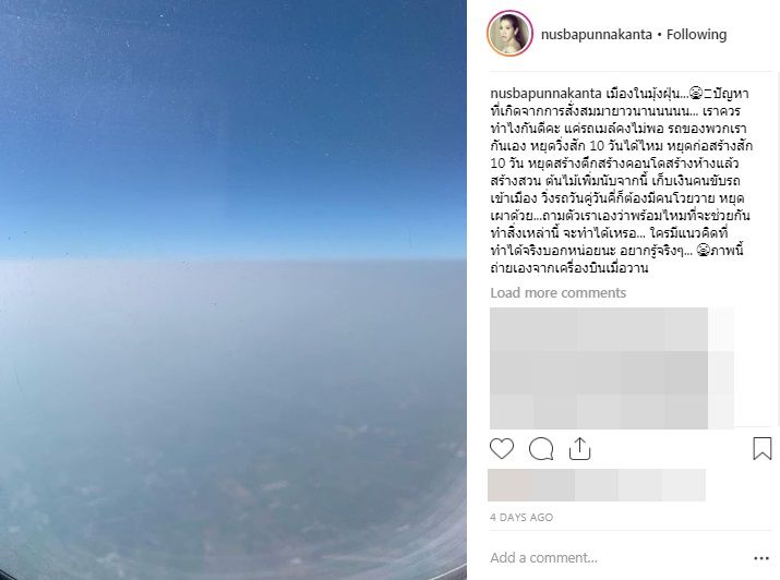 เป็นเรื่องเป็นราวขึ้นมาจนได้! หลังจากที่นักแสดงชื่อดัง “นุสบา ปุณณกันต์” ภรรยาของ “นายพุทธิพงษ์ ปุณณกันต์” รองเลขาธิการนายกรัฐมนตรี ได้ออกมาโพสต์ภาพที่ถ่ายจากเครื่องบิน เผยให้เห็นฝุ่นละอองหนาที่กำลังปกคลุมกรุงเทพฯ ในขั้นวิกฤต พร้อมแนะวิธีแก้ปัญหา หาทางออกร่วมกัน