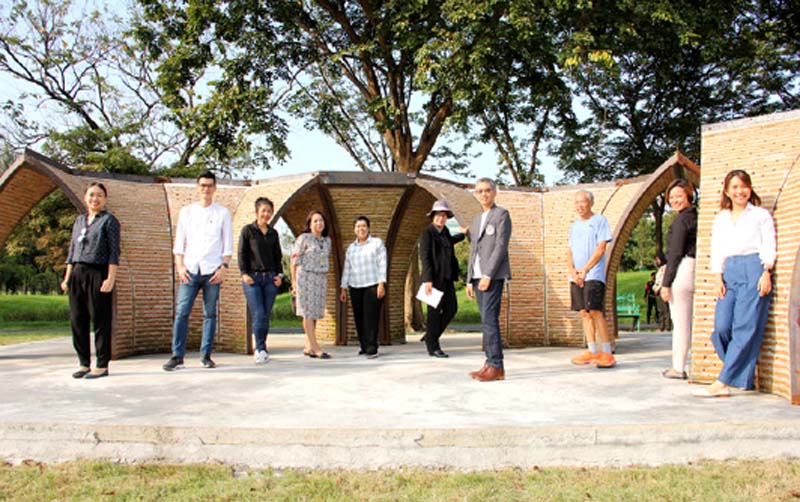 ผศ.ดร.อภิรดี เกษมศุข ประธานจัดงานสถาปนิก’61 ส่งมอบผลงานสถาปัตยกรรม “Working Space Pavilion” โดยมี อารมย์ วงษ์มหา ผอ.สนง.สวนสาธารณะสำนักสิ่งแวดล้อม กทม. เป็นผู้แทนรับมอบ