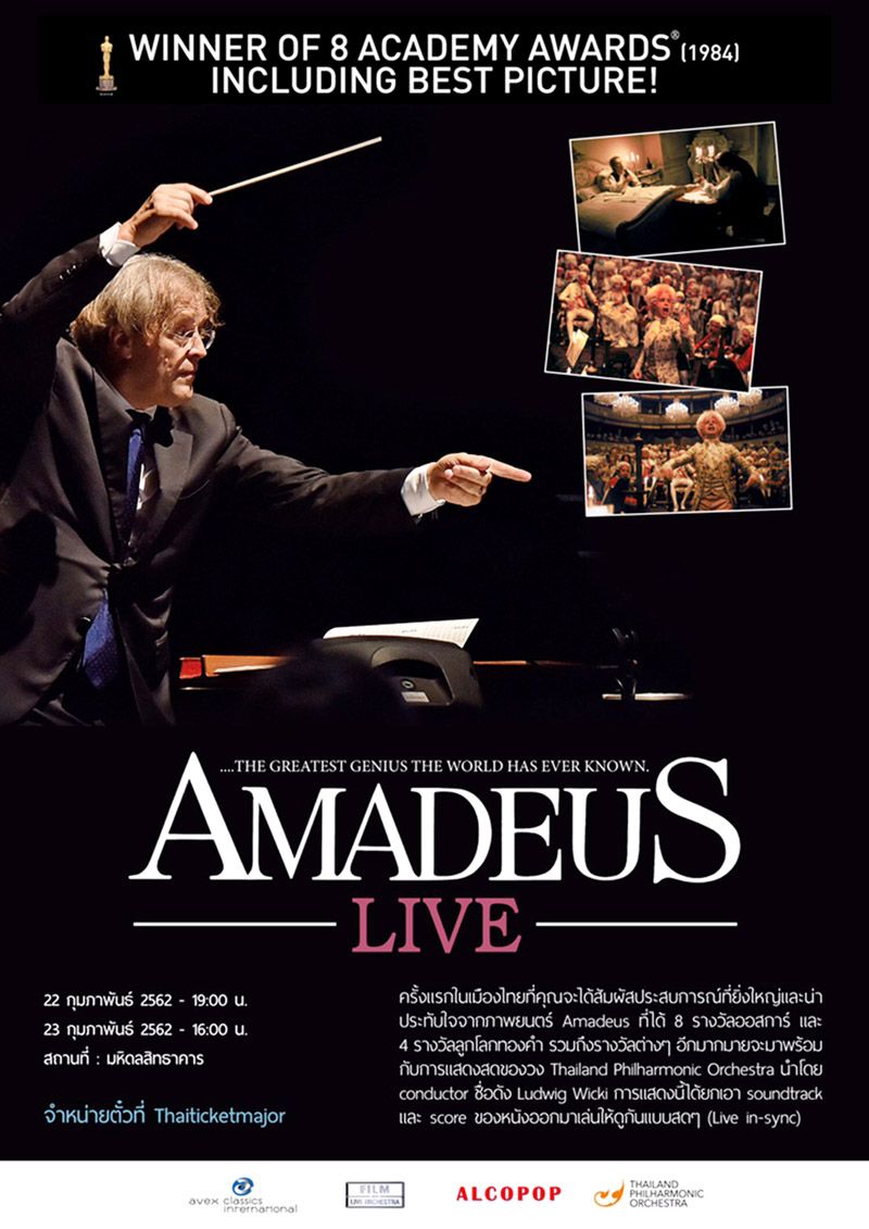 Amadeus หนังคลาสสิกขึ้นหิ้งเจ้าของ 8 รางวัลออสการ์ ได้ถูกนำมาดัดแปลง สู่ Amadeus LIVE ที่นำเอาภาพยนตร์เรื่องนี้ กลับมาฉายในระบบ 4K HD screen พร้อมนำเอาเพลงสกอร์ และเพลงซาวนด์แทรค (ซึ่งเป็นผลงานของ Mozart)มาบรรเลงให้ฟังกันแบบสดๆ Amadeus LIVE ประสบความสำเร็จอย่างสูงในการไปจัดแสดงตามฮอลล์ต่างๆ มาแล้วทั่วโลก และครั้งนี้คอนดักเตอร์ระดับโลกอย่าง Ludwig Wicki จะมาเป็นคอนดักเตอร์ในงานนี้ ผนึกกำลังกับ วงออร์เคสตราแถวหน้าของไทย นักร้องนักดนตรี ร้อยกว่าชีวิต จากวง Thailand Philharmonic Orchestra และ Choirs of Mahidol University ผู้สนใจซื้อบัตรได้ที่ http://www.Thaiticketmajor.com บัตรราคา 10,000 (Sold Out)/4,000/3,500/ 3,000/2,500/2,000/1,500 บาท
