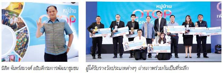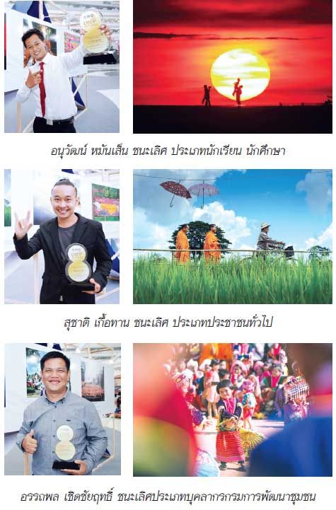 อนุวัฒน์ หมันเส็น อายุ 25 ปี นักศึกษาคณะวิทยาการจัดการ มหาวิทยาลัยราชภัฏสงขลา ใช้ทักษะความสามารถด้านการถ่ายภาพ ลั่นชัตเตอร์ โชว์ผลงานภาพ “ท่องเที่ยวสุขใจ ในหมู่บ้าน OTOP”ถ่ายทอดบรรยากาศยามเย็นริมทะเล บ้านปากบารา ต.ปากน้ำ อ.ละงู จ.สตูล คว้ารางวัลชนะเลิศ ประเภทนักเรียน นิสิต นักศึกษา เป็นภาพที่ถ่ายทอดมุมหนึ่งในหมู่บ้าน OTOP ที่เหมาะสำหรับนักท่องเที่ยวที่ชื่นชอบธรรมชาติ ชมทะเล เดินเล่นริมชายหาดในบรรยากาศพระอาทิตย์ตกยามเย็น เป็นมนต์เสน่ห์เล็กๆ ที่ซ่อนอยู่ในอำเภอละงู เมืองทางผ่านสำหรับนักท่องเที่ยวที่จะเดินทางไปยังเกาะหลีเป๊ะซึ่งเป็นสถานที่ท่องเที่ยวชื่อดังของจังหวัดสตูลที่ใครได้พบเห็นเป็นต้องหยิบกล้องถ่ายรูปขึ้นมาบันทึกภาพความทรงจำกันอย่างแน่นอน ต่อด้วย สุชาติ เกื้อทาน อายุ 34 ปี อาชีพธุรกิจส่วนตัว ช่างภาพฟรีแลนด์จากดินแดนเขตวัฒนธรรมริมแม่น้ำโขง บอกเล่าวิถีชุมชนผ่านภาพถ่าย “ถนนสายวัฒนธรรม” ส่งต่อสายใยผูกพันระหว่าง คน ศาสนา และวัฒนธรรม บ้านนาหมอม้า ต.นาหมอม้า อ.เมือง จ.อำนาจเจริญ คว้ารางวัลชนะเลิศ ประเภทประชาชนทั่วไป ภาพนี้ถ่ายทอดบรรยากาศถนนคอนกรีตที่ชาวบ้านร่วมใจกันสร้าง ตัดผ่านทุ่งนาเขียวขจีเพื่อเป็นเส้นทางสัญจรระหว่างหมู่บ้านไปยังวัดดงเฒ่าเก่า โดยในทุกๆ เช้าพระภิกษุจะเดินบิณฑบาตทุกเช้า ถือเป็นประเพณีชุมชนที่สืบทอดกันมายาวนาน อีกทั้งยังเป็นสถานที่ท่องเที่ยวที่สวยงาม ท่ามกลางทุ่งนาเขียวขจี วิถีชุมชนพื้นบ้านที่ยังคงไว้ซึ่งความเป็นอัตลักษณ์เฉพาะถิ่นที่ยังไม่ถูกกลืนหายไปตามกาลเวลา ปิดท้ายกันที่ อรรถพล เชิดชัยฤทธิ์ อายุ 35 ปีนักวิชาการพัฒนาชุมชนปฏิบัติการสำนักงานพัฒนาชุมชน อ.ชัยบาดาล จ.ลพบุรี ร่วมถ่ายทอดเรื่องราวเชิงวัฒนธรรมผ่านเลนส์กล้องด้วยภาพถ่าย “งานบุญดาราอั้ง” งานประเพณีท้องถิ่นของกลุ่มชาติพันธุ์ดาราอั้ง หรือปะหล่องในดินแดนอารยธรรมล้านนา บ้านนอแลต.ม่อนปิ่น อ.ฝาง จ.เชียงใหม่ ซได้รับรางวัลชนะเลิศ ประเภทบุคลากรของกรมการพัฒนาชุมชน มีโอกาสท่องเที่ยวและทำงานในหลากหลายหมู่บ้าน หนึ่งในนั้นคือ ชุมชนดาราอั้ง ซึ่งเป็นกลุ่มชาติพันธุ์ที่อพยพจากเมียนมา มาตั้งรกรากที่ อ.ฝาง มีวิถีชีวิตใกล้ชิดธรรมชาติอยู่กันอย่างสุขธรรม ปราศจากอบายมุข ยึดถือคติคำสอนของพระพุทธศาสนา ทุกหมู่บ้านจะมีวัดเป็นศูนย์รวมจิตใจ และมีประเพณีวัฒนธรรมที่เคร่งครัดเป็นเอกลักษณ์ เช่น ประเพณีงานบุญดาราอั้งที่ชาวบ้านทุกเพศทุกวัย รวมถึงเด็กๆ จะมีส่วนร่วมในงานบุญของชุมชนเหมือนในภาพงาน “งานบุญดารา