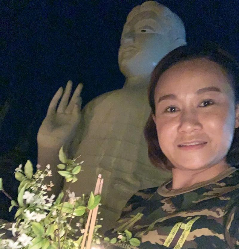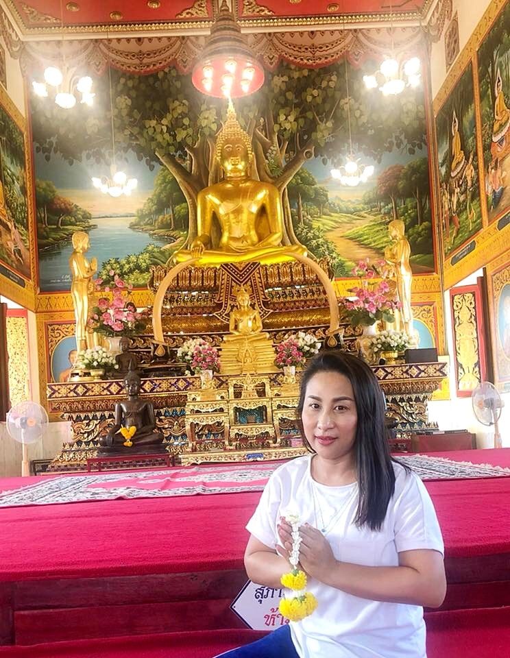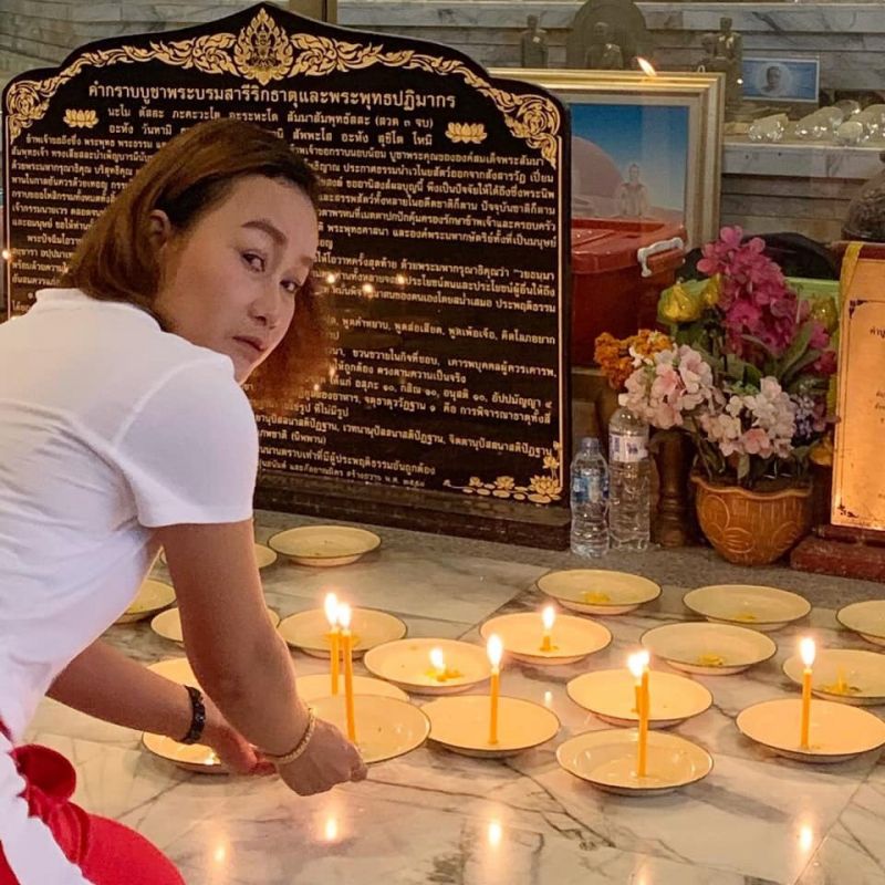 “เป็นคนชอบทำบุญอยู่แล้วค่ะ ยิ่งวันพระใหญ่แบบนี้ ยิ่งพลาดไม่ได้ อย่างน้อยก็ขอให้ได้มากราบไว้บูชาปิดทองหน้าพระ ถวายกระเบื้องมุงหลังคาวัด เสร็จแล้วก็เวียนเทียนรอบโบสถ์ ให้จิตใจสงบก่อนขออุทิศให้กับพ่อแม่ครูบาอาจารย์ และเจ้ากรรมนายเวร รวมทั้งฝากผลบุญไปถึงแฟนเพลงให้มีความสุขทุกๆ คนนะคะ”