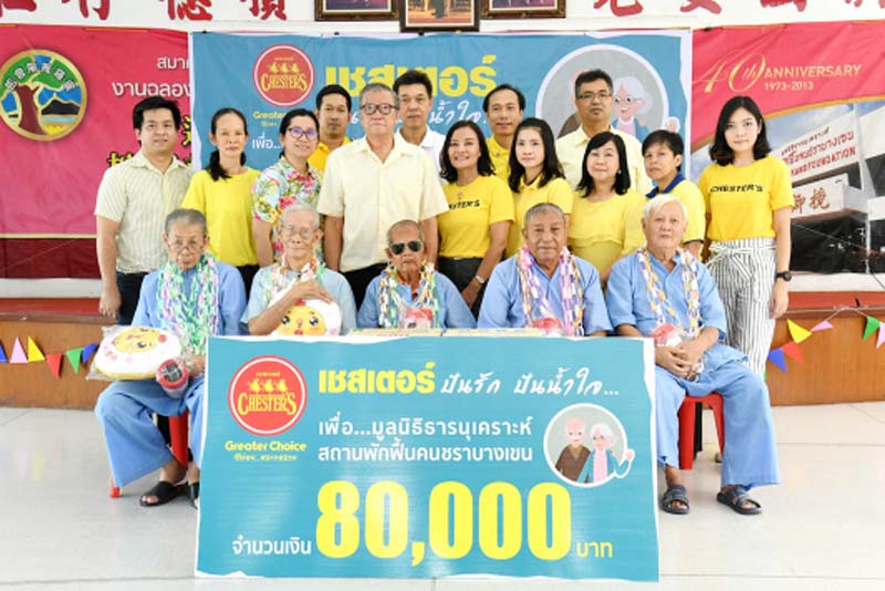บริษัท เชสเตอร์ฟู้ด จำกัด โดยผู้บริหารและพนักงานเชสเตอร์จิตอาสา 120 คน จัดกิจกรรมมอบความสุขและสร้างกำลังใจให้แก่ผู้สูงอายุ มูลนิธิธารนุเคราะห์ สถานพักฟื้นคนชราบางเขน ในโครงการ “เชสเตอร์ ปันรัก ปันน้ำใจ” ปีที่ 6 โดยกิจกรรมประกอบด้วย การจัดเลี้ยงอาหารกลางวัน กิจกรรมสันทนาการร่วมกับผู้สูงอายุ และการปรับทัศนียภาพในสถานพักฟื้นฯ พร้อมมอบสิ่งของอุปโภคบริโภค และเงินบริจาค มูลค่ารวม 80,000 บาท ที่ได้จากการร่วมสมทบทุนของ ผู้บริหาร พนักงาน และลูกค้าเชสเตอร์ ให้แก่มูลนิธิได้ใช้ประโยชน์ต่อไป