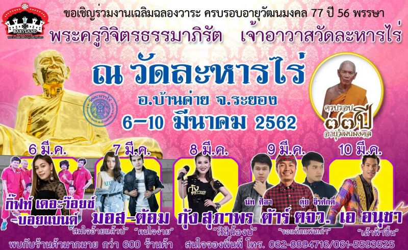 งานนี้ไม่บอกต่อไม่ได้แล้วกับงานบุญของ 3 พันธมิตรแห่งวงการลูกทุ่งอินดี้ นำโดย เบบี้แลนด์ ออแกไนเซอร์ค่ายลายไทยเรคคอร์ดและค่ายซาวด์มีแฮง จับมือจัดงานประจำปีเฉลิมฉลองวาระครบรอบอายุวัฒนมงคล 77 ปี 56 พรรษา พระครูวิจิตรธรรมาภิรัต เจ้าอาวาสวัดละหารไร่(หลวงปู่ทิม) อ.บ้านค่าย จ.ระยอง ในวันที่ 6 – 10 มีนาคม 2562 โดยงานนี้จัดฟรีคอนเสิร์ตขนทัพนักร้องใจบุญอย่างต้าร์ตจว. กุ้ง สุภาพร เอ อนุชา กิ๊ฟท์เดอะว๊อยซ์มอส รัศมี ต้อม สีดา นัท ศิลา ดุ่ย จิรศักดิ์ งานนี้ใครอยู่ใกล้ก็อย่าลืมแวะไปชมและทำบุญกันได้นะ
