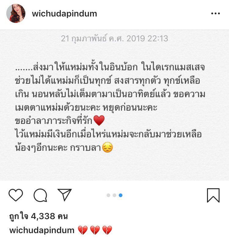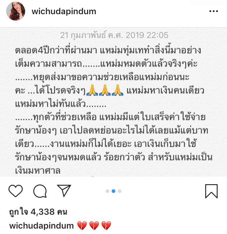 ตลอด 4 ปีกว่าที่ผ่านมา แหม่มทุ่มเททำสิ่งเหล่านี้มาอย่างเต็มความสามารถ แหม่มหมดตัวแล้วจริง ๆ ค่ะ หยุดส่งมาขอความช่วยเหลือแหม่มก่อนนะคะ ได้โปรดจริง ๆ แหม่มหาเงินคนเดียว แหม่มหาไม่ทันแล้ว ทุกตัวที่ช่วยเหลือ แหม่มมีแต่ใบเสร็จค่าใช้จ่ายรักษาน้อง ๆ เอาไปลดหย่อนอะไรไม่ได้เลยแม้สักบาทเดียว งานแหม่มก็ไม่ได้เยอะ เอาเงินเก็บมาใช้รักษาน้อง ๆ จนหมดแล้ว ร้อยกว่าตัว สำหรับแหม่มเป็นเงินมหาศาล ส่งมาให้แหม่มทั้งในอินบ็อกซ์ ในไดเรกต์แมสเสจ ช่วยไม่ได้แหม่มก็เป็นทุกข์ สงสารทุกตัว ทุกข์เหลือเกิน นอนหลับไม่เต็มตามาเป็นอาทิตย์แล้ว ขอความเมตตาแหม่มด้วยนะคะ หยุดก่อนนะคะ ขออำลาภารกิจที่รัก ไว้แหม่มมีเงินอีกเมื่อไหร่ แหม่มจะกลับมาช่วยเหลือน้อง ๆ อีกครั้งนะคะ กราบลา”