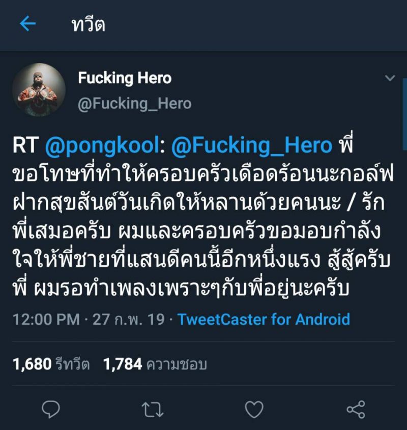 ซึ่งหนุ่มกอล์ฟก็มาตอบกลับว่า รักเสมอครับ ผมและครอบครัวขอมอบกำลังใจให้พี่ชายที่แสนดีคนนี้อีกหนึ่งแรง สู้สู้ครับพี่ ผมรอทำเพลงเพราะๆกับพี่อยู่นะครับ นอกจากนี้ยังมีบรรดาแฟนเพลงของป๊อปเข้ามาให้กำลังใจพร้อมบอกว่ารอฟังเพลงของหนุ่มป๊อปและให้ผ่านเรื่องราวนี้ไปได้อีกด้วย