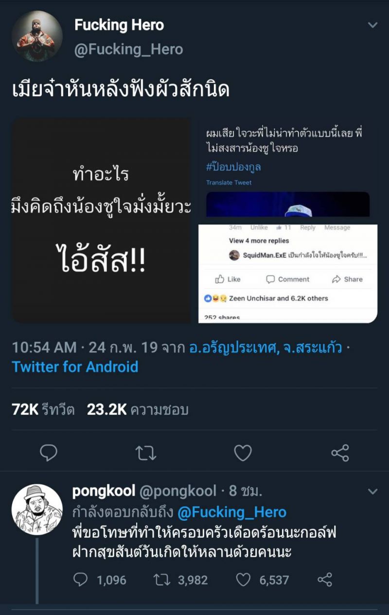 ถือว่าเป็นกระแสร้อนทีเดียวสำหรับกรณีคบซ้อนของ ‘ป๊อป ปองกูล’ ที่บรรดาชาวเน็ตต่างเข้าใจผิดและลากครอบครัวของ ‘กอล์ฟ ฟักกลิ้งฮีโร่’ เข้ามาเกี่ยวข้อง ทำให้กอร์ฟถูกชาวเน็ตถล่มเละ เนื่องจากรูปร่างหน้าตาที่คล้ายคลึงกัน บางคนกลับเอาเรื่องนี้มาล้อเล่นจนทำให้ใครหลายคนเข้าใจผิดและลามปามไปถึงน้อง‘ชูใจ’ อีกด้วยซึ่งล่าสุดวันเกิดของน้องชูใจ หนุ่ม ป๊อปได้ทวีตข้อความไปถึงหนุ่มกอร์ฟว่า ขอโทษที่ทำให้ครอบครัวเดือนร้อนนะกอล์ฟ ฝากสุขสันต์วันเกิดให้หลานด้วยคนนะ
