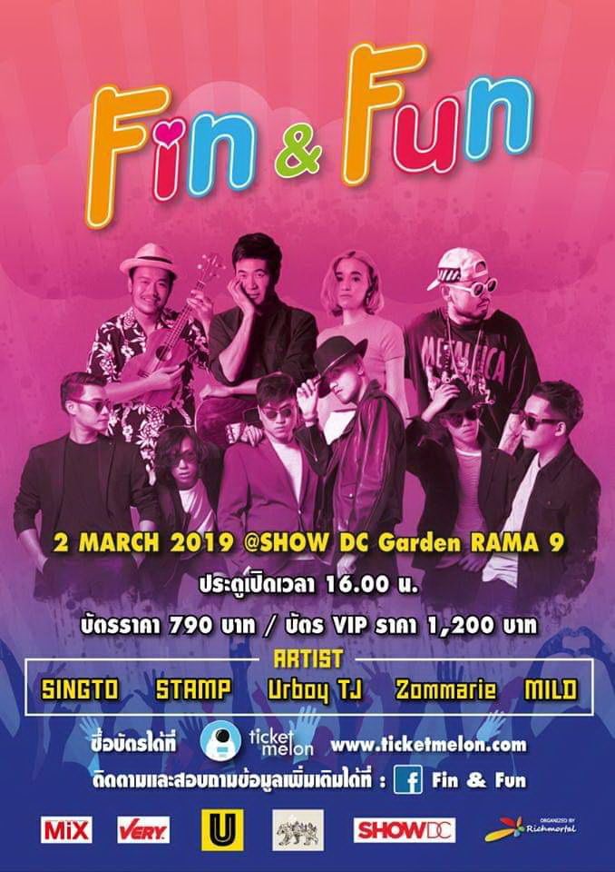 เตรียมตัวสนุกสุดฟินแล้วมาดิ้นกันแบบลืมโลก กับคอนเสิร์ต “FIN & FUN” ในวันเสาร์ที่ 2 มีนาคม 2562 เวลา 16.00 น. เป็นต้นไป ณ SHOW DC Garden พระราม 9 จำหน่ายบัตรแล้ววันนี้ที่ http://www.ticketmelon.com ติดตามรายละเอียดเพิ่มเติมได้ที่ เฟซบุ๊กแฟนเพจ : Fin & Fun