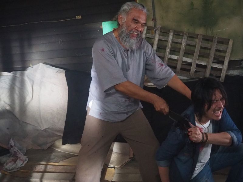 ฉากนี้ทีมงานได้เนรมิตบ้านไม้ในป่า ย่านกรมชลประทาน ให้เป็นบ้านของ สมพร โดยผู้กำกับฯ ได้เริ่มถ่ายซีน บุ๋มบิ๋ม ใช้มีดอีโต้ฟันที่หัวไหล่ของ แบงค์ ผ่านพ้นไปอย่างราบรื่น จากนั้นเป็นหน้าที่ของทีมเอฟเฟ็กต์ทำการตกแต่งบาดแผลที่หัวไหล่ของ แบงค์ ให้เลือดสาดสมจริง และได้มีการซักซ้อมคิวการเข้าปะทะกันระหว่าง แบงค์ กับ บุ๋มบิ๋มก่อนจะเริ่มถ่ายกันต่อ แต่ในระหว่างที่ทั้งคู่นัวเนียกันอย่างดุเดือด แบงค์ ล้มผิดจังหวะ เอามือยันไว้กับพื้น ได้รับบาดเจ็บจนข้อมือส้น จนผู้กำกับฯ ต้องสั่งพักกองชั่วคราวเพื่อดูอาการของ แบงค์ แต่ด้วยสปิริตความเป็นนักแสดงมืออาชีพ หลังจากเช็คสภาพข้อมือและกินยาเรียบร้อย แบงค์ ได้ขอลุยถ่ายต่อทันที โดยพระเอกหนุ่มได้เปิดเผยว่า