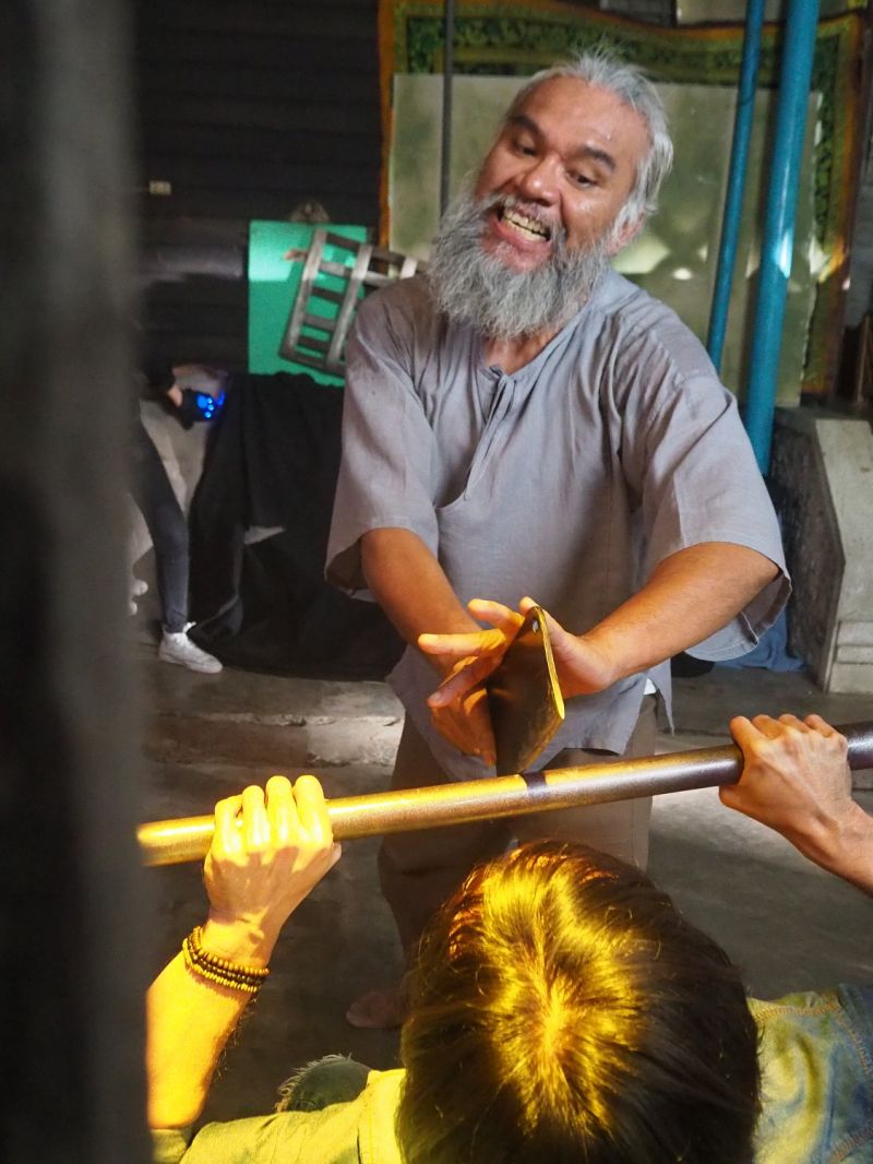 “เป็นอีกหนึ่งฉากที่สนุกไม่แพ้ฉากอื่นๆ เลยครับ แต่ฉากนี้จะหนักหน่อยเพราะเราเป็นฝ่ายถูกกระทำ คือเราจะมาหาของไปปราบปีศาจแต่ดันมาเจอพี่บุ๋มบิ๋ม ที่รับบท สมพร มีพลังปีศาจที่แรงเยอะ ทำให้เราพลาดท่า จึงต้องมีล้มลุกคลุกคลานกันใหญ่เลย ฉากนี้ซีจีน้อย เน้นการปะทะกันเต็มร้อยเลย ก็มีเสียวๆ กลัวจะโดนมีดของจริงอยู่เหมือนกัน ถ้าโดนคงเลือดสาดจริงๆ ไม่ต้องเอฟเฟ็กต์ช่วยเลยครับ ก่อนจะถ่ายก็ได้มีการซักซ้อมคิวกับพี่บุ๋มบิ๋มแล้ว แต่ก็มีจังหวะพลาดล้มมือส้นนิดหน่อย ไม่เป็นไรครับ ไม่โดนมีดอีโต้ก็ดีแล้ว ส่วนใครแพ้ใครชนะบอกไม่ได้ ต้องไปดูกันเอาเองในนางฟ้าล่าผี ปี 3 ครับ”
