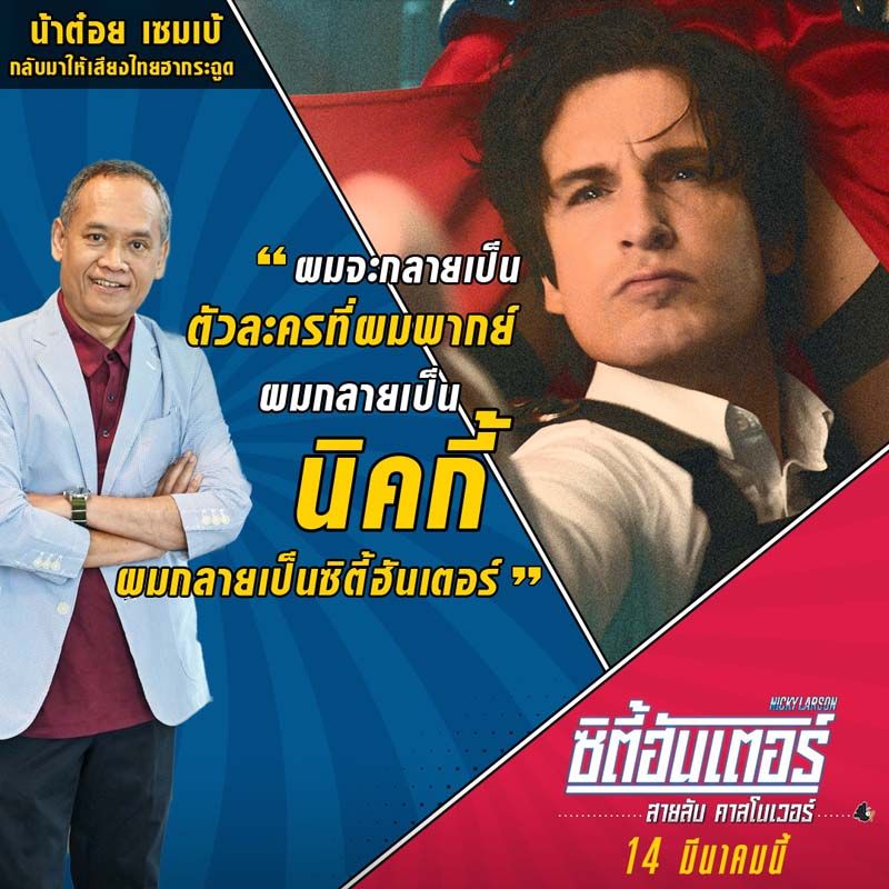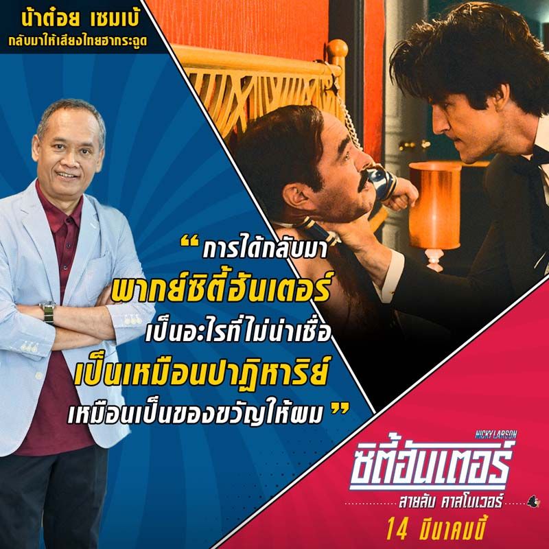 ถือเป็นอีกหนึ่งปรากฏการณ์ครั้งสำคัญของวงการภาพยนตร์ เมื่อนักพากย์การ์ตูนอันดับหนึ่งขวัญใจแฟนๆ ทั้งประเทศ น้าต๋อย เซมเบ้ กับการกลับมาให้เสียงไทยในภาพยนตร์แอ็คชั่น-คอมเมอดี้ ที่สร้างจากอนิเมะระดับปรากฏการณ์อย่าง ซิตี้ฮันเตอร์ สายลับคาสโนเวอร์ ซึ่งน้าต๋อย เซมเบ้ เป็นผู้ที่พากย์เสียงเป็นสายลับหนุ่ม ซาเอบะ เรียว ในเวอร์ชั่นต้นฉบับ โดยการกลับมาของซิตี้ฮันเตอร์ในเวอร์ชั่นภาพยนตร์ครั้งนี้ น้าต๋อย เซมเบ้ มาให้เสียงเป็น นิกกี้ ลาร์สัน สายลับหนุ่มจอมทะลึ่งที่ยังคงคาแร็คเตอร์ทะเล้นและลุยจัดเต็มของพระเอก รับประกันความสนุกสนานตามแบบเวอร์ชั่นการ์ตูนอย่างแน่นอน ร่วมสร้างเสียงฮาเป็นทวีคูณด้วย ทีมพากย์พันธมิตร ที่มาร่วมให้เสียงตัวละครอื่น ๆ อย่างถึงพริกถึงขิง