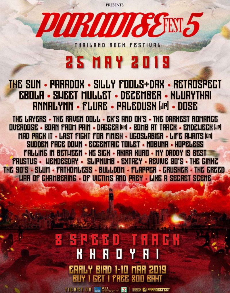 แจ้งข่าวดีแบบด่วน ๆ สำหรับบรรดาคนพันธุ์ร็อกทั้งหลายให้ทราบ ณ เวลานี้ให้รีบจับจองบัตรพร้อมนับถอยหลังเข้าสู่ “พาราไดซ์ เฟสต์ (Paradise FEST) 5”สวรรค์ของคนพันธุ์ร็อกกันได้แล้วตั้งแต่วันนี้ ถึงวันที่ 10 มีนาคม 2562 ที่จะถึงนี้เนื่องด้วยเพราะในครั้งที่5นี้เปิดจำหน่ายบัตรถึงแค่วันที่ 10 มี.ค. 62 เท่านั้น หากคุณพลาด คุณจะพลาดกับปรากฏการณ์สุดยิ่งใหญ่ครั้งแรกของวงการ “ร็อก” เมืองไทย ที่เพลงร็อกจะลั่นขึ้นในเสาร์ที่ 25 พ.ค. 2562ท่ามกลางขุนเขาบนพื้นที่กว่า 100 ไร่อย่าง “8 Speed”เขาใหญ่ จ.นครราชสีมา ที่รับรองได้ว่าจะเดือดกว่าทุกปี กับกองทัพศิลปินพันธุ์ร็อกทุกสายพันธุ์ที่มีมากมายกว่า 200 ชีวิต บนเวทีการแสดงที่ดุเดือดถึง 3 เวที!!!อาทิเช่นPALEDUSK (JP) / FLURE / SWEET MULLET / EBOLA / PARADOX / THE SUN / RETROSPECT / SILLY FOOLS + DAX / DEZEMBER / KLUAYTHAI / ANNALYNN / THE RAVEN DOLL / THE LAYERS / DOSE / EX’S AND OH’S / THE DARKEST ROMANCE / OVERDOSE / BORN FROM PAIN / DAGGER (HK) / BOMB AT TRACK /ENDZWECK (JP) / MAD PACK IT / LAST FIGHT FOR FINISH / UGOSLABIER / LIFE AWAITS (CN) / SUDDEN FACE DOWN / ECCENTRIC TOILET / NOBUNA / HOPELESS / FALLING IN BETWEEN / HE SICK / AKIRA KURO / MY DADDY IS BEST / FAUSTUS / THE GREED / WENDESDAY / SLIPNUMB / EXTAZY / REVIVE 90’S / THE GINKZ / THE 90’S / SLUM / LIKE A SECRET SCENE / FATHOMLESS / BULLDOM / FLAPPER / CRUSHER / WAR OF CHAMBERING / OF VICTIMS AND PREY