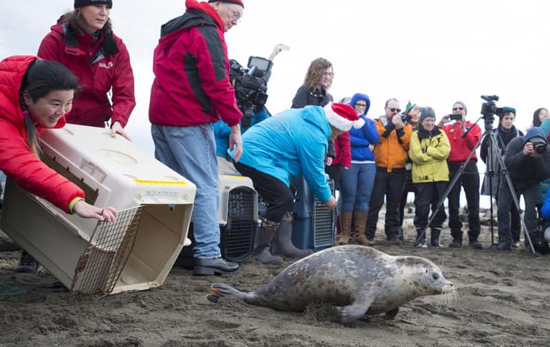 ปล่อยแมวน้ำ : ลูกแมวน้ำค่อยๆ คลานออกจากกรงกลับลงทะเลหลังได้รับการปล่อยจากเจ้าหน้าที่ศูนย์ช่วยเหลือสัตว์เลี้ยงลูกด้วยนมในทะเลของพิพิธภัณฑ์สัตว์น้ำแวนคูเวอร์ โดยพวกมันได้รับการช่วยเหลือหลังได้รับบาดเจ็บและได้รับการดูแลรักษาอาการจนหายดีแล้ว