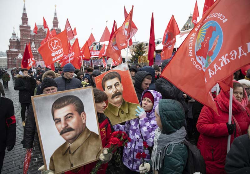 คิดถึงสตาลิน : ผู้ชุมนุมชาวรัสเซียถือรูปภาพของโจเซฟ สตาลิน อดีตผู้นำเผด็จการของอดีตสหภาพโซเวียต ระหว่างรอเข้าแถวเพื่อวางดอกไม้ที่หลุมศพ ของเขา ในกรุงมอสโก ประเทศรัสเซีย เนื่องในวาระครบรอบวันคล้ายวันเกิด 139 ปี ของสตาลิน
