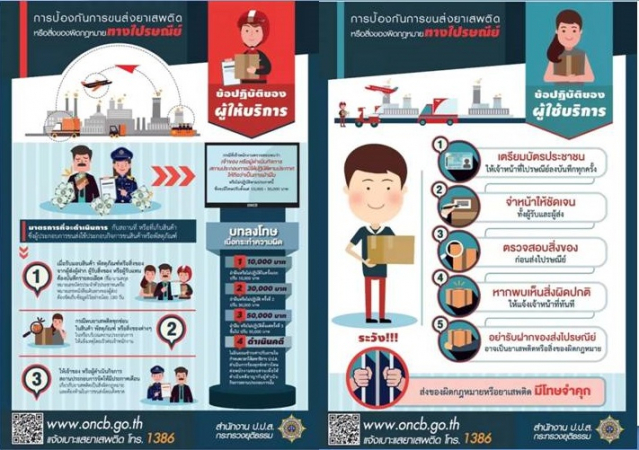 Niyom said the ONCB has published information to raise public awareness about the issue, adding that people call the 1386 hotline round the clock if they suspect drug trade or violation of the drugs law by courier businesses.