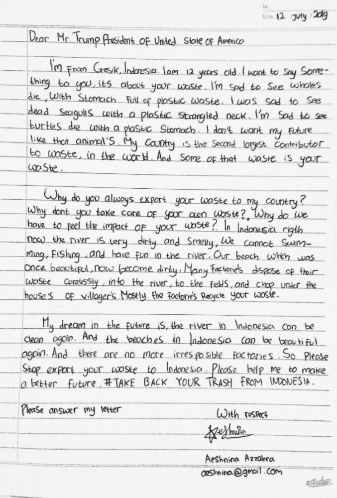 ‘Why do you always export your waste to my country?’: Indonesian pre-teen writes to Trump