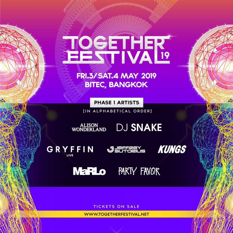 เพียงแค่เผย Line Up ดีเจแถวหน้าระดับหัวกระทิของโลกเฟสแรกที่เปิดตัว ก็เรียกเสียงฮือฮาได้อย่างหนัก กับ Line Up สุดเดือด ศิลปินกลุ่มแรกของ Together Festival 2019 ปีนี้ เตรียมตัวพบกับ DJ SNAKE ขอต้อนรับเจ้าพ่อสาย Trap อย่าง “DJ SNAKE” ที่การันตีความเดือดอย่างแน่นอน เดือดจนคอหักกันไปข้างเลย! ปีนี้พี่งูของเรา จะมาพร้อมกับตัวแม่อีกคน ALISON WONDERLAND เธอคนนี้ได้เคยแสดงเอาไว้ตอนมาไทยครั้งก่อนได้อย่างดุเดือดมากๆ หลายคนถึงกับเรียกร้องอยากให้กลับมาอีก! ครั้งนี้เธอกลับมาหวดอย่างเต็มที่เลย GRYFFIN (Live) การนำพา “GRYFFIN” มาเล่นครั้งนี้แบบ Live set! รับรองเลยว่าทุกคนต้องจดจำกับความอลังการของการเล่นเครื่องดนตรีแบบสดๆให้เราได้ชมกัน , JEFFREY SUTORIUS (DASH BERLIN) ด้วยการกลับมาของ “JEFFREY SUTORIUS” หรือที่เรารู้จักกันดีในชื่อ “DASH BERLIN” กลับมาให้พวกเราหายคิดถึงกันไปเลย, และ สุดท้ายเสริมทัพด้วย 3 แสบ KUNGS, MARLO และ PARTY FAVOR พร้อมรอ Line Up กลุ่มที่ 2 ที่แสบไม่แพ้กันแน่นอน