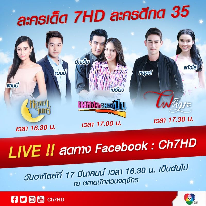 ช่อง 7HD เดินหน้ามัดใจแฟน ๆ อย่างต่อเนื่อง ล่าสุดส่งนักแสดงนำจากละครแนวโรแมนติกหลาก อารมณ์ทั้งดราม่า แอ็กชั่น ครบรส หลงเงาจันทร์-เพลงรักเพลงปืน-ไฟหิมะ ได้แก่ แซมมี่ เคาวเวลล์ / บิ๊กเอ็ม กฤตฤทธิ์ บุตรพรม / เปรี้ยว ทัศนียา การสมนุช / หลุยส์ เฮส / แอมป์ พีรวัศ กุลนันท์วัฒน์ และแก้วใส คริสตัล มาพบปะแฟน ๆ อย่างใกล้ชิด พร้อมชวนติดตามผลงาน ในกิจกรรม “ละครเด็ด 7HD ละครดี กด35” วันอาทิตย์ที่ 17 มี.ค.นี้ ที่ สวนจตุจักร (ประตู3) เริ่มตั้งแต่เวลา 13.00 น. เป็นต้นไป