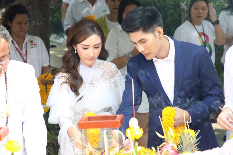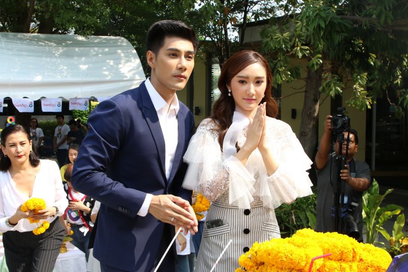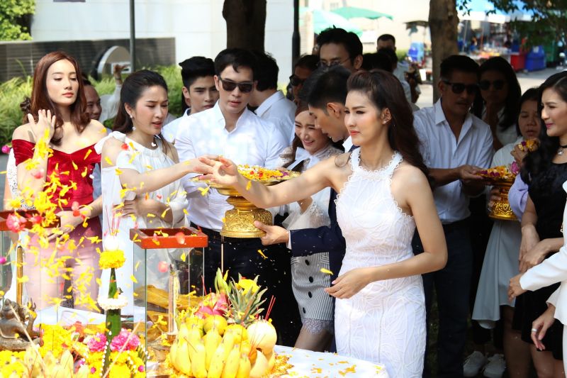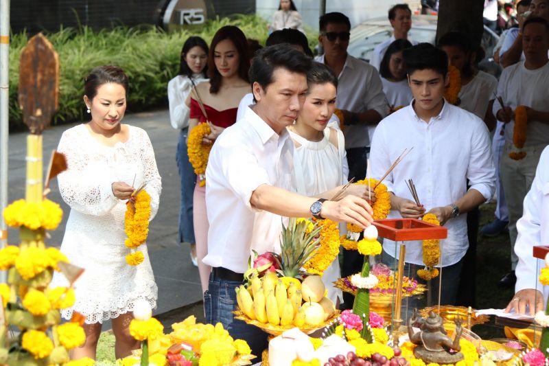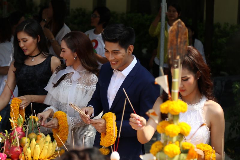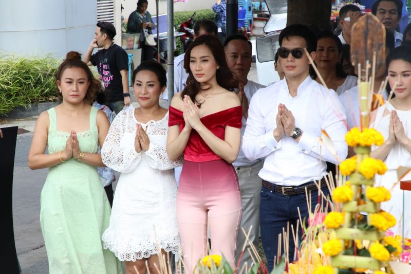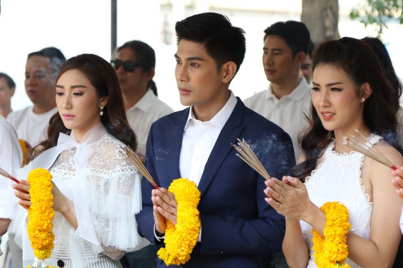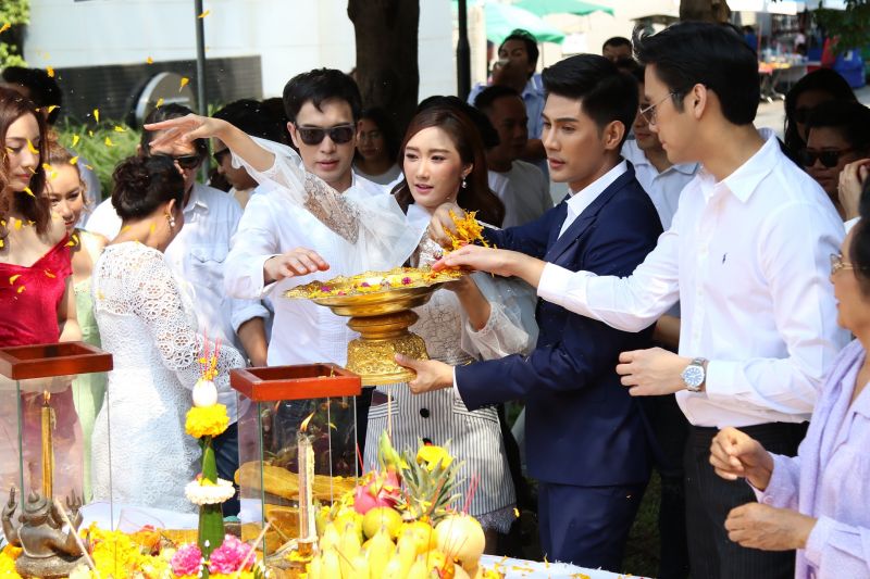 บรรยากาศในงานเต็มไปด้วยกองทัพสื่อมวลชน ที่มารอเก็บภาพกันแต่เช้า ถึงเวลาฤกษ์ดี เหล่านักแสดงเริ่มทยอยลงมาที่ลานพิธี เปิดตัวด้วย คู่พระนาง มังกร มาในชุดสูทหล่อสมคาแรคเตอร์ ควงคู่มากับนางเอกยีน ที่งานนี้ต้องยกนิ้วให้ เพราะถึงจะขาเจ็บจนบวม จากอุบัติเหตุกลางกองที่เดินเตะน็อตขาเครนตั้งกล้องจนเลือดอาบกลางกองซีรี่ย์ แต่ก็ยังสปิริตแรงมาร่วมงานได้ เสริมด้วยทัพด้วยนักแสดงมากฝีมือที่ตบเท้ามาร่วมพิธีบวงสรวงกันคับคั่ง อาทิ ฟ้าใส อรจิรา, ภูมิ ภูริพันธ์ , นก อุษณีย์ , ไอซ์ อธิชนัน , ลาล่า–ลูลู่ อาร์สยาม ,บอส พุทธิพงษ์ , มิ้ม รัตนาภรณ์ ,เบนซ์ พิสิฐพล, อมยิ้ม จุฬาลักษณ์, บอย โชคชัย , เอ็กซ์ จตุรงค์ , อาเมตตา รุ่งรัตน์ , แพร รัชนี ฯลฯ