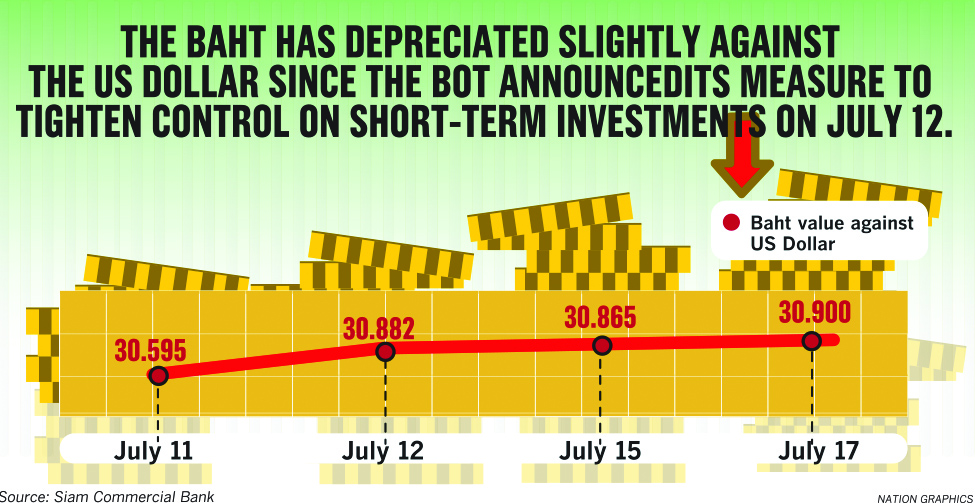 “The baht has weakened slightly after our announcement to tighten short-term capital inflows,” said BOT governor Veerathai Santiprabhob. “We expect the measure to have more impact on the baht’s strength five days after our announcement leading up to July 22, when the measure will take effect.”