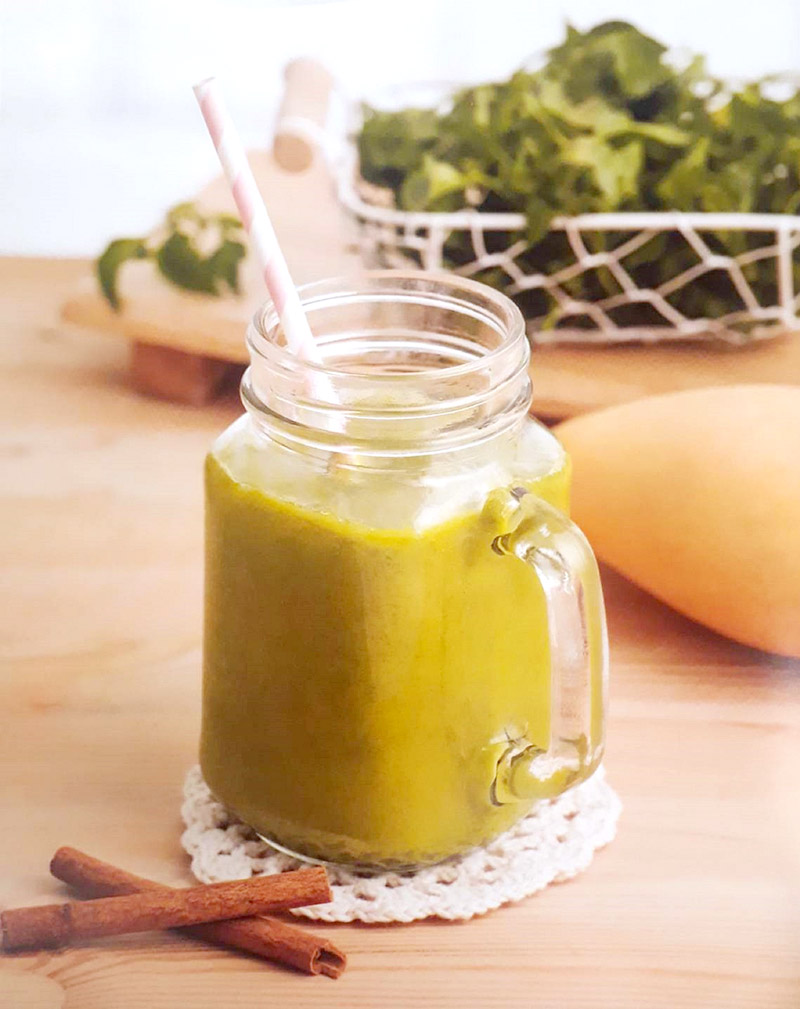 ส่วนผสม มะม่วงสุก ½ ลูก, กล้วยน้ำว้า(½ ลูกใหญ่) 1 ลูก, ผักสลัดหรือวอเตอร์เครส 1 ลูก, ขิงอ่อนหั่นชิ้นบาง 1-2, ชิ้นผงขมิ้น (เริ่มจากน้อยกันขม) 1/8-½ ช้อนชา, ผงอบเชย 1/8 ช้อนชา และน้ำเปล่า 100 มิลลิลิตร
