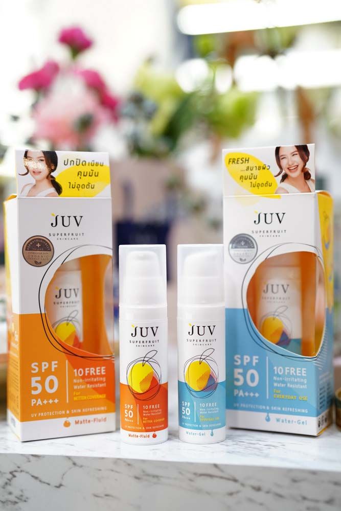 และ JUV Matte-Fluid UV Protection SPF 50 PA+++: ครีมกันแดดเนื้อมูสที่คิดค้นมาเพื่อปกป้องและปกปิดได้มากกว่า ช่วยปกป้องผิวจากมลภาวะและฝุ่นละอองอนุภาคเล็ก ปกป้องผิวสูงสุด 5 เท่า หยุดทุกแสงที่ทำร้ายผิวได้นาน 12 ชั่วโมง และยังมีส่วนผสมของ Super fruit ช่วยบำรุงผิวไปในตัว เหมาะสำหรับคนที่อยากให้ผิวเรียบเนียนในขั้นตอนเดียว โดยที่ไม่ต้องลงครีมหลายตัว ใช้แทนรองพื้นแล้วแต่งหน้าตามได้ งามจากธรรมชาติ และสวยสุขภาพดี ได้ตั้งแต่วันนี้ เป็นต้นไป
