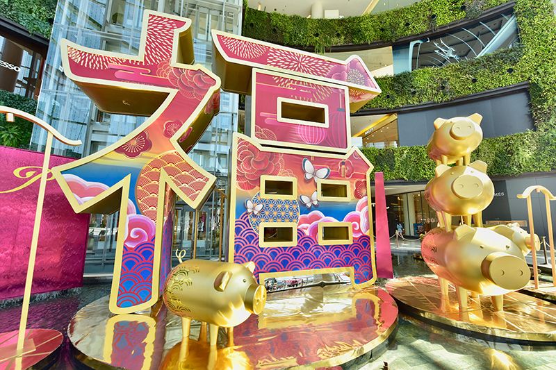 พร้อมกับชวนชมการจัดแสดงประติมากรรมตุ๊กตาหมูนำโชค 9 ตัวในอิริยาบถแตกต่างกันสะท้อนถึงมหามงคลที่จะมีขึ้นตลอดปีนี้ ได้แก่ ความสุข ความรักมั่งมีศรีสุข สมหวัง โชคดี รุ่งเรือง อายุยืนยาว เจริญก้าวหน้า และเงินทองไหลมาโดยนำเทคนิค Paper Mache Handmade เพ้นท์ลวดลายสวยงามสร้างสรรค์เป็นผลงานทั้งหมดมีขนาดความสูงตั้งแต่1.50-2.20 เมตร รายล้อมด้วยลูกโป่งและโคมจีนเขียนตัวอักษรมงคล ณ ดิสคัฟเวอรี่พลาซ่า สยามดิสคัฟเวอรี่