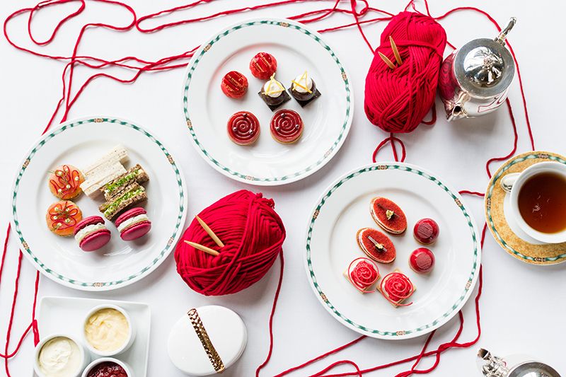 ในโอกาสพิเศษนี้ เชฟนิโคลาส์ เพลลัว หัวหน้าพ่อครัวเบเกอรี่ของโรงแรมได้รังสรรค์ขนมและของว่างสำหรับชุดน้ำชายามบ่ายขึ้นเป็นพิเศษ โดยได้รับแรงบันดาลใจมาจาก “KNIT” (การถักทอชีวิต) ซึ่งมีไหมพรมสีแดงเป็นวัสดุหลัก ขนมหวานและของว่างที่เชฟนิโคลาส์รังสรรค์ขึ้นเพื่อเติมเต็มประสบการณ์การรับชมการแสดงศิลปะในครั้งนี้ จึงมีสีแดงเป็นสีหลัก และมีรูปทรงที่ได้รับแรงบันดาลใจมาจากเส้นไหมพรม เช่น มองบลังค์ ที่มีเนื้อครีมด้านบนเป็นเส้นคล้ายไหมพรมสีแดง เป็นต้น ทั้งศิลปะการจิบน้ำชายามบ่ายและการชมศิลปะการแสดงที่เกิดขึ้นควบคู่กันนี้จะสร้างความอิ่มเอมให้แก่ประสาทสัมผัสทั้งห้าของท่าน รวมไปถึงโลกแห่งจินตนาการของผู้ชมจะได้รับการเปิดกว้างยิ่งขึ้น