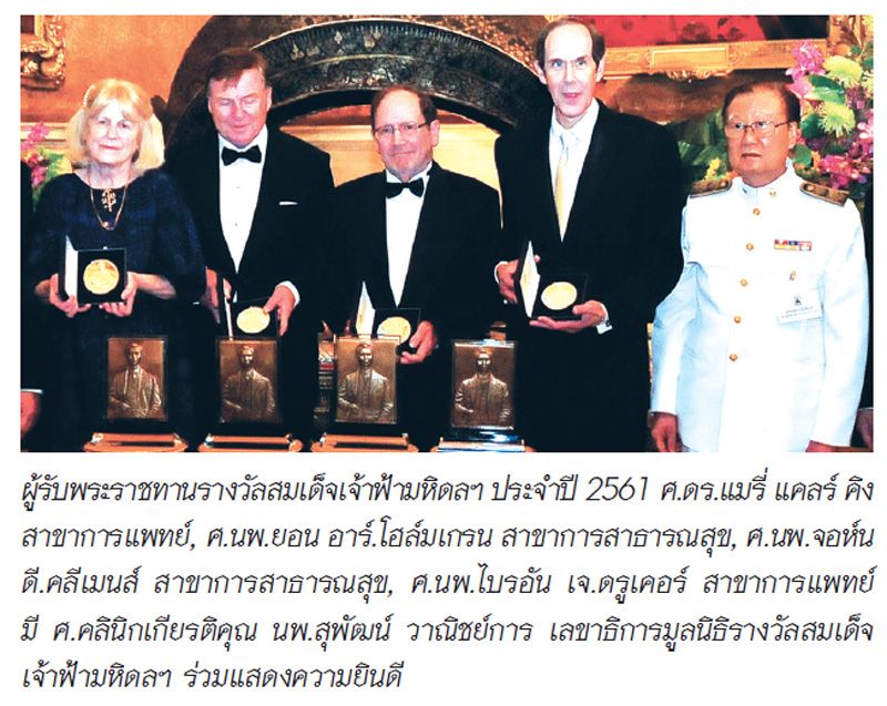 สมเด็จพระเจ้าอยู่หัว ทรงพระกรุณาโปรดเกล้าฯ ให้ สมเด็จพระเทพรัตนราชสุดาฯ สยามบรมราชกุมารี เสด็จพระราชดำเนินแทนพระองค์ ในพิธีพระราชทานรางวัลสมเด็จเจ้าฟ้ามหิดล ประจำปี 2561 ในปีนี้ผู้ได้รับพระราชทานรางวัลสมเด็จเจ้าฟ้ามหิดล ประจำปี สาขาการแพทย์ 2 ท่าน ได้แก่ ศ.นพ.ไบรอัน เจ. ดรูเคอร์ (Professor Brian J. Druker) และ ศ.ดร.แมรี่ แคลร์ คิง (Professor Dr.Mary-Claire King) ผู้ค้นพบยีนที่เป็นสาเหตุของโรคมะเร็งเต้านม สาขาการสาธารณสุข 2 ท่าน ได้แก่ ศ.นพ.จอห์น ดี. คลีเมนส์ (Professor John D. Clemens) และ ศ.นพ.ยอน อาร์. โฮล์มเกรน (Professor Jan R. Holmgren) ณ พระที่นั่งจักรีมหาปราสาท พระบรมมหาราชวังเมื่อวันที่ 31 มกราคม 2561