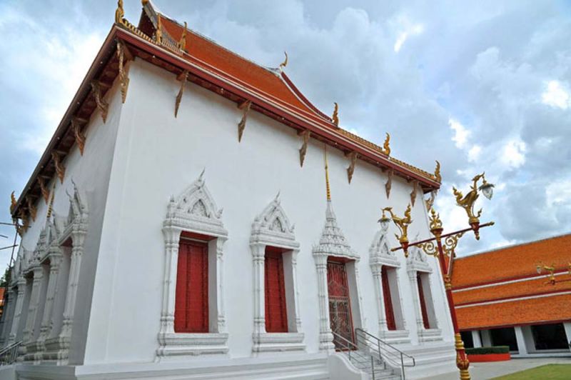 สำหรับพระราชานุสาวรีย์ของสมเด็จเจ้าฟ้ามหาวชิรุณหิศฯ ประดิษฐานอยู่ ณ หน้าอาคารปฏิบัติธรรม ชื่อ เบญจมราชวรานุสรณ์ ที่หน้าบันชั้นบนของอาคารมีตราสัญลักษณ์ของพระราชวงศ์จักรีประดิษฐาน ซึ่งถือได้ว่าเป็นอาคารภายนอกพระบรมมหาราชวังเพียงแห่งเดียวที่ได้รับพระบรมราชานุญาตให้ประดิษฐานตราสัญลักษณ์สำคัญนี้ ส่วนหน้าบันชั้นถัดลงมามีตราประจำพระองค์ของสมเด็จเจ้าฟ้ามหาวชิรุณหิศฯ คือรูปมงกุฎมีช่อชัยพฤกษ์ประดับ ประดิษฐานอยู่ โดยมีตัวอักษร ร.จ.บ.ต.ว.ห.จ. ย่อมาจาก เราจะบำรุงตระกูลวงศ์ให้เจริญ ซึ่งหมายถึงจะทรงทำนุบำรุงประเทศชาติประชาชนให้มีความเจริญ เนื่องจากทรงตระหนักดีว่าพระมหากษัตริย์ทรงเปรียบเสมือนพ่อของแผ่นดิน ดังนั้นจึงมีพระราชภารกิจต้องทำนุบำรุงชาติบ้านเมืองและประชาชนให้มีความสุขความเจริญทั่วทั้งแผ่นดิน
