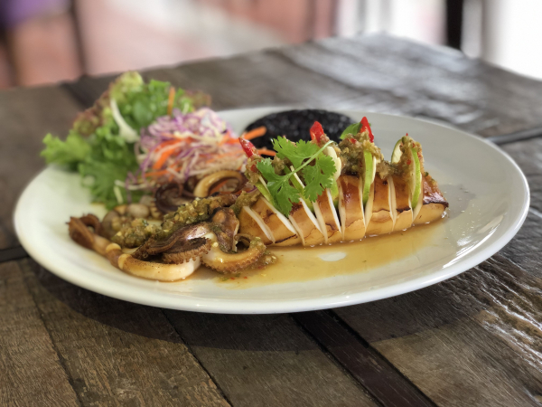 The first culinary specialty being showcased at Aleenta Hua Hin is barbecued squid, a simple yet sublime recipe from chef Thitipong Worakham, who is known as Chef M. Most mornings, Chef M visits the small fishing village of Pak Nam Pran, where the Pranburi River flows into the sea and bountiful fishing grounds lie just offshore. The seafood sold here is straight off the boat, and squid is a specialty.
