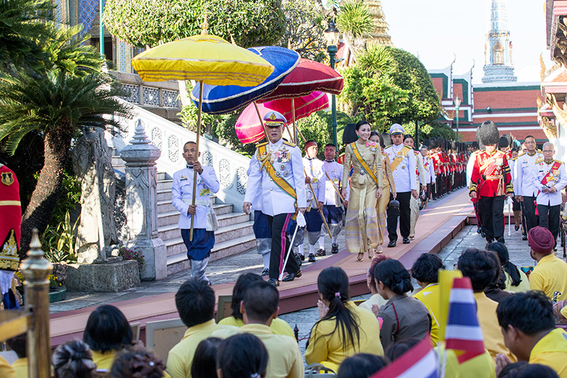 Their Majesties the King and Queen arrive at the Temple of the Emerald Buddha