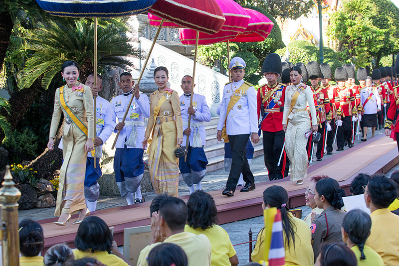 Their Majesties the King and Queen arrive with Their Royal Highnesses Princesses Bajrakitiyabha Narendiradebyavati and Sirivannavari Narirattana Rajakanya and Prince Dipangkorn Rasmijoti at the Temple of the Emerald Buddha at the Grand Palace, where His Majesty granted Samanasak honorary ecclesiastical titles to Chinese and Vietnamese priests. // Nationphoto: Tanachai Pramanpanich