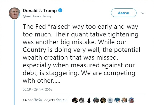 His tweet foreshadowed a Tuesday (July 30) meeting of the US Federal Reserve that, together with the Wednesday (July 31) is considering whether or not to increase the base interest rate.