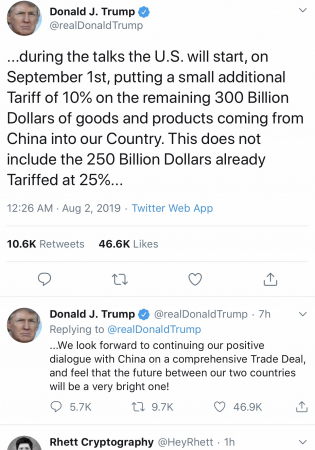 Trump’s tweet read: “During the talks the U.S. will start, on September 1st, putting a small additional Tariff of 10% on the remaining 300 Billion Dollars of goods and products coming from China into our Country. This does not include the 250 Billion Dollars already Tariffed at 25%…