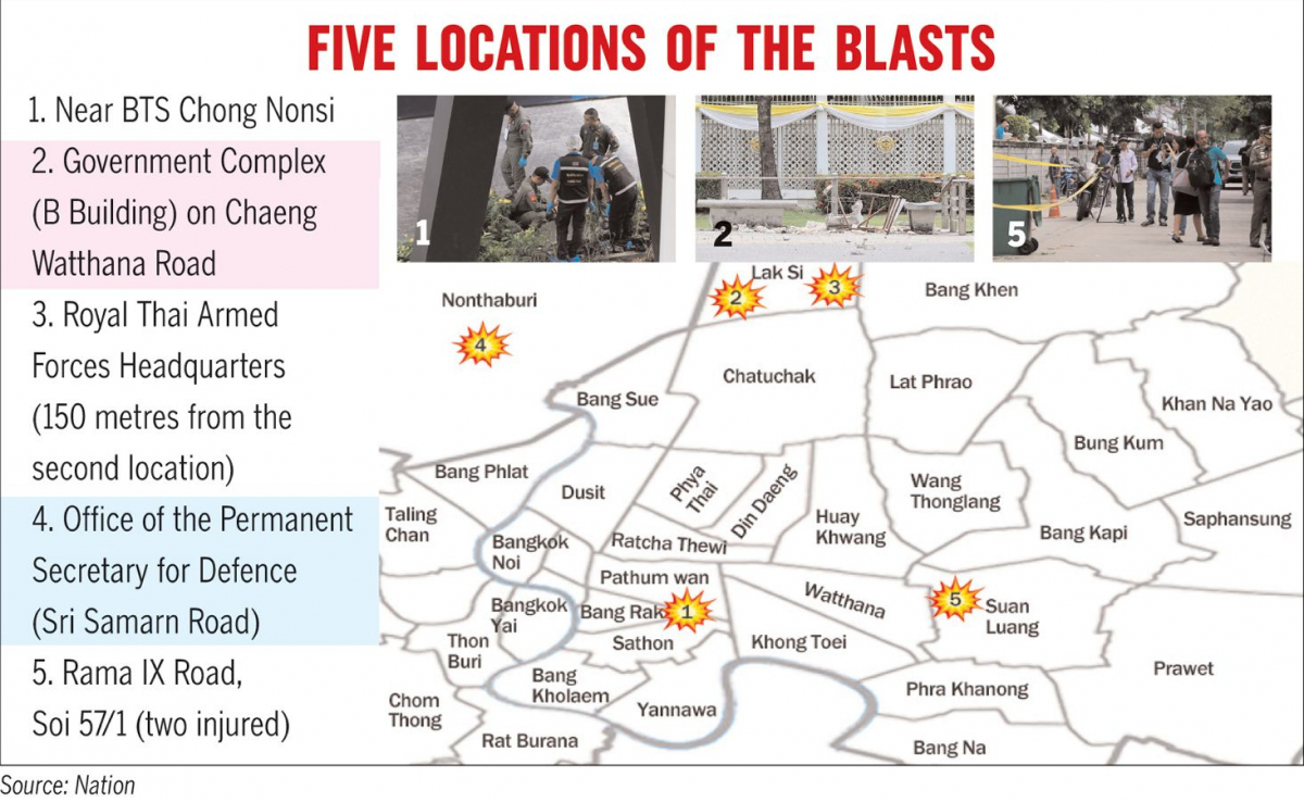 The were many locations where the bombs went off. Five of them occurred at the Government Complex (B Building) on Chaeng Watthana road, a spot near Chong Nonsee station on the BTS Skytrain line, Soi Rama IX, the Royal Thai Armed Forces Headquarters, and the Office of the Permanent Secretary For Defence (Sri Samarn Road).