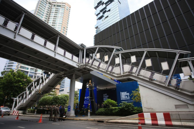 Police said an explosion occurred in front of the Mahanakhon Building near the station, with a second going off in a sidewalk garden under the station.