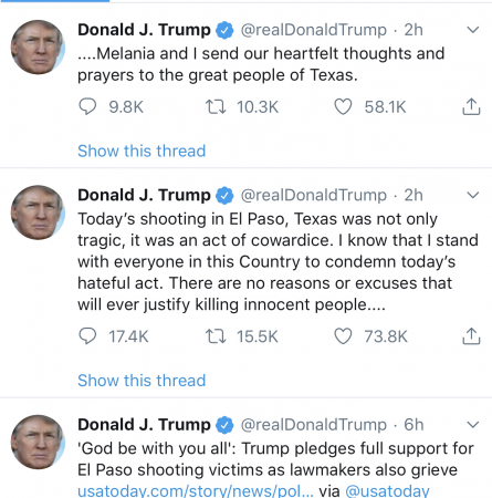 “Today’s shooting in El Paso, Texas was not only tragic, it was an act of cowardice. I know that I stand with everyone in this Country to condemn today’s hateful act. There are no reasons or excuses that will ever justify killing innocent people….”