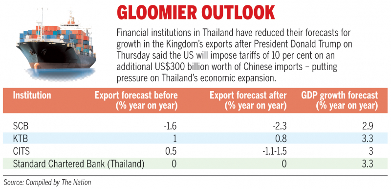 Mana Nimitvanich, first vice president of the Krungthai Bank’s Global Business Development and Strategy Group, said: “The global economic slowdown which will result from the tariff hike to be implemented in September will not only cause Thai exports to China to drop, but Thai exports to various countries around the world may also take a hit from this trade tension escalation.”