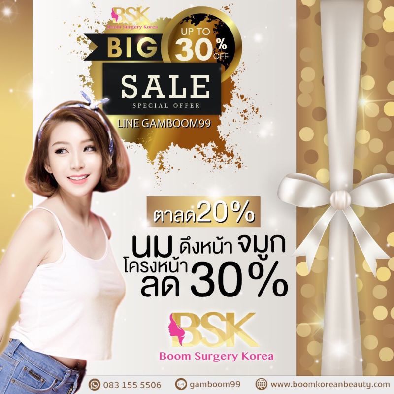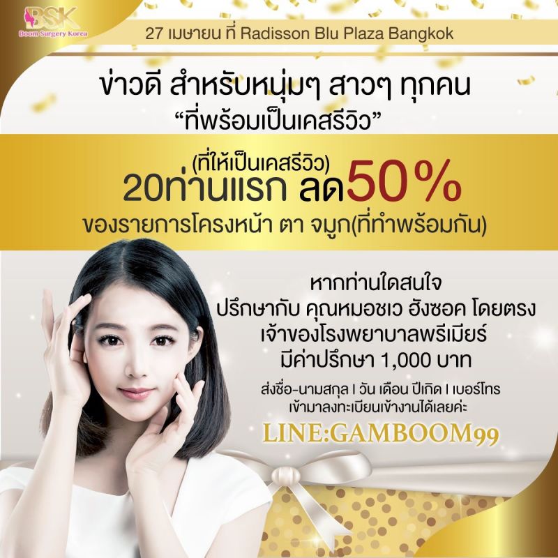 และในเดือนเมษายน 2019 ทางบอสสาวสุดสวยของ BSK อย่าง “คุณแก้มบุ๋ม สุพัตรา ไชยวงค์ญาติ” ขอจัดโปรฯ ลดราคาแบบหนักๆ ต้อนรับซัมเมอร์ถึง 50% สำหรับทำโครงหน้า จมูก ตา พร้อมกัน สิทธิพิเศษเฉพาะ 20 ท่านแรก ที่เข้ามาปรึกษาศัลยกรรมภายในงานนี้ กับทางคุณหมอชเวฮังซอค และสำหรับราคาส่วนลดทำเฉพาะอย่าง อาทิ ทำตา ลดทันที 20% จมูก หน้าอก โครงหน้า ดึงหน้า ลดทันที 30% ใครอยากสวย อยากหล่อ อยากหน้าปังในปี 2019 ต้องรีบมางานปรึกษากับ งานปรึกษาศัลยกรรมเกาหลี กับคุณหมอชเวฮังซอก โดยเอเจนซี่ศัลยกรรมเกาหลี BSK ในวันเสาร์ที่ 27 เมษายนนี้ ณ โรงแรมเรดิสัน บลู พลาซ่า กรุงเทพ เวลา 9.00-17.00 น. ค่าลงทะเบียนปรึกษาศัลยกรรมท่านละ 1,000 บาท